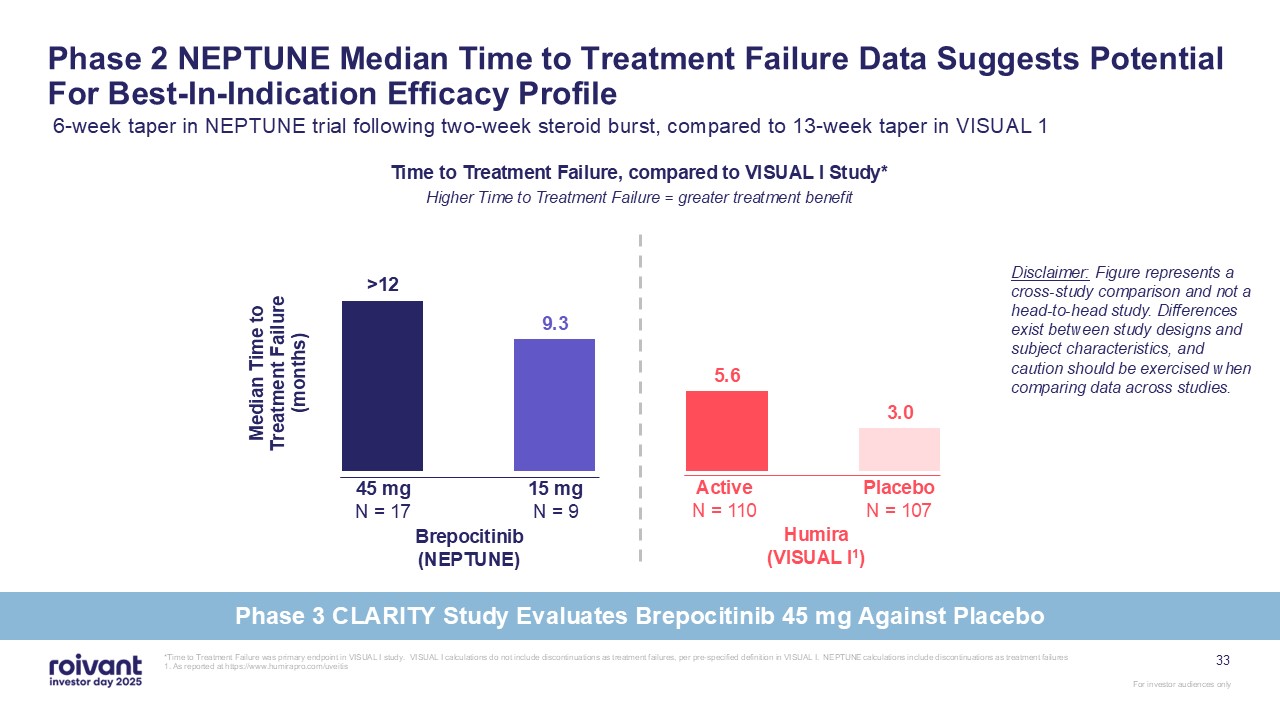 Phase 2 NEPTUNE Median Time to Treatment Failure Data Suggests Potential For Best-In-Indication Efficacy Profile   6-week taper in NEPTUNE trial following two-week steroid burst, compared to 13-week taper in VISUAL 1     45 mg  N = 17  Brepocitinib  (NEPTUNE)  15 mg  N = 9  Active  N = 110  Humira  (VISUAL I1)  Placebo  N = 107  Disclaimer: Figure represents a cross-study comparison and not a head-to-head study. Differences exist between study designs and subject characteristics, and caution should be exercised when comparing data across studies.   Time to Treatment Failure, compared to VISUAL I Study*  Higher Time to Treatment Failure = greater treatment benefit  *Time to Treatment Failure was primary endpoint in VISUAL I study. VISUAL I calculations do not include discontinuations as treatment failures, per pre-specified definition in VISUAL I. NEPTUNE calculations include discontinuations as treatment failures   1. As reported at https://www.humirapro.com/uveitis   33  Phase 3 CLARITY Study Evaluates Brepocitinib 45 mg Against Placebo