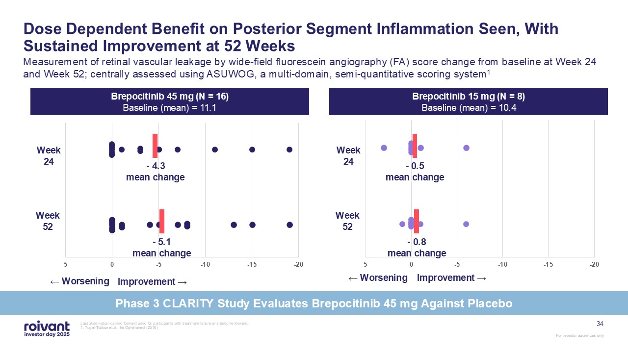 Last observation carried forward used for participants with treatment failure or intercurrent event.  1. Tugal-Tutkun et al., Int Ophthalmol (2010)  Dose Dependent Benefit on Posterior Segment Inflammation Seen, With Sustained Improvement at 52 Weeks  Measurement of retinal vascular leakage by wide-field fluorescein angiography (FA) score change from baseline at Week 24 and Week 52; centrally assessed using ASUWOG, a multi-domain, semi-quantitative scoring system1  ← Worsening  Improvement →  - 0.5mean change  - 4.3mean change  - 0.8mean change  - 5.1mean change  ← Worsening  Improvement →  Brepocitinib 45 mg (N = 16)  Baseline (mean) = 11.1  Brepocitinib 15 mg (N = 8)  Baseline (mean) = 10.4  Week 24  Week 52  Week 24  Week 52  34  Phase 3 CLARITY Study Evaluates Brepocitinib 45 mg Against Placebo