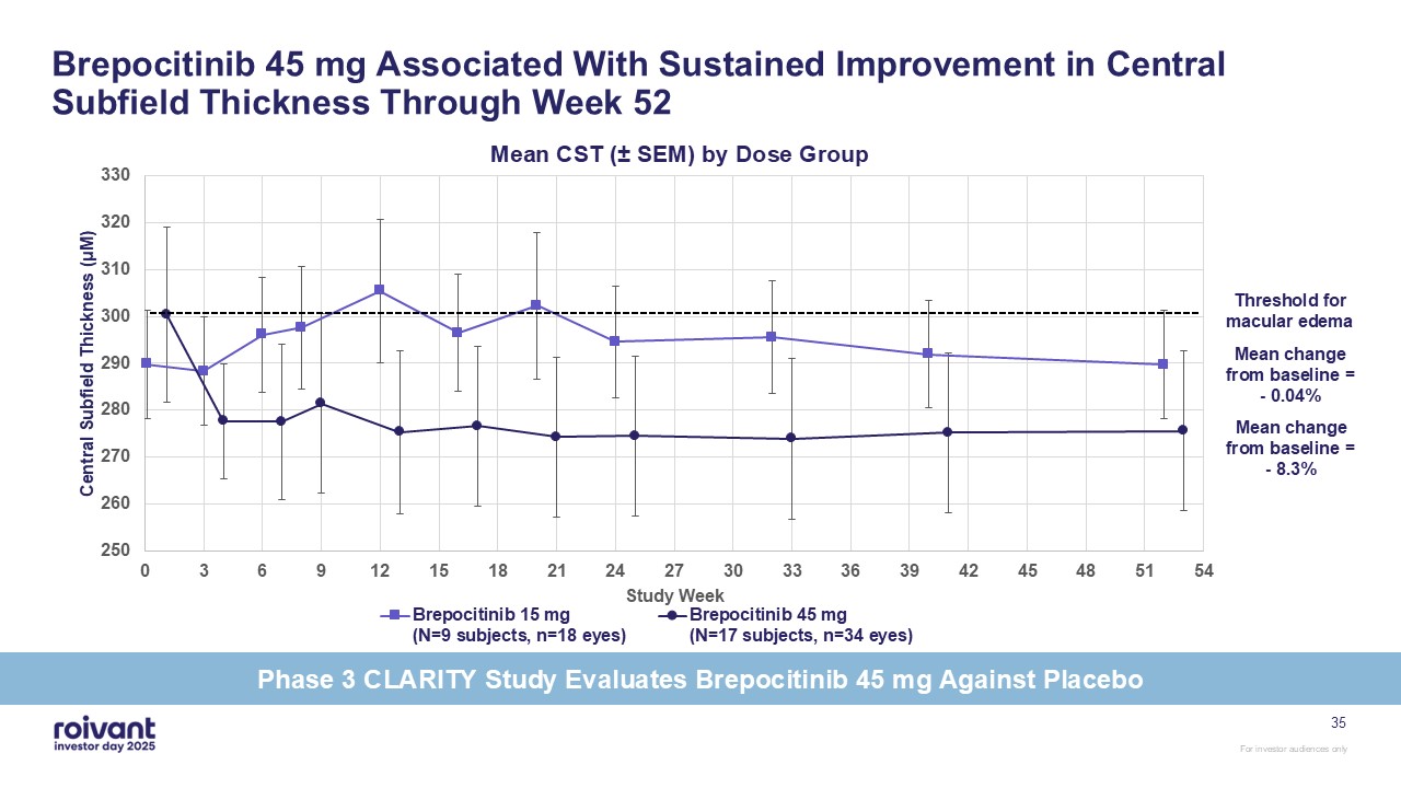 Brepocitinib 45 mg Associated With Sustained Improvement in Central Subfield Thickness Through Week 52  35  Threshold for macular edema  Mean change from baseline =   - 0.04%  Mean change from baseline =   - 8.3%  Phase 3 CLARITY Study Evaluates Brepocitinib 45 mg Against Placebo