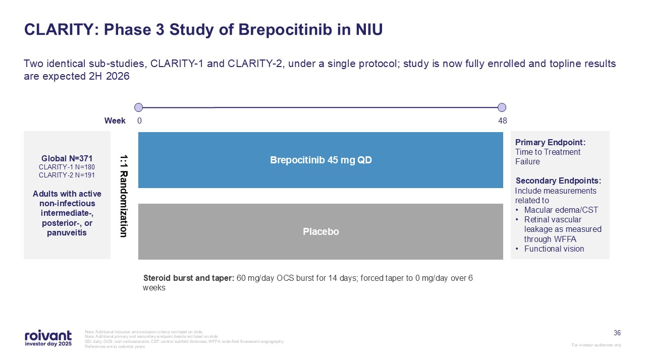 36  CLARITY: Phase 3 Study of Brepocitinib in NIU  Two identical sub-studies, CLARITY-1 and CLARITY-2, under a single protocol; study is now fully enrolled and topline results are expected 2H 2026  Note: Additional inclusion and exclusion criteria not listed on slide.  Note: Additional primary and secondary endpoint details not listed on slide  QD: daily; OCS: oral corticosteroids; CST: central subfield thickness; WFFA: wide-field fluorescein angiography  References are to calendar years  Global N=371  CLARITY-1 N=180  CLARITY-2 N=191  Adults with active non-infectious intermediate-, posterior-, or panuveitis  Placebo  Brepocitinib 45 mg QD  48  Week  0  Primary Endpoint:   Time to Treatment Failure  Secondary Endpoints: Include measurements related to   Macular edema/CST  Retinal vascular leakage as measured through WFFA  Functional vision  1:1 Randomization  Steroid burst and taper: 60 mg/day OCS burst for 14 days; forced taper to 0 mg/day over 6 weeks