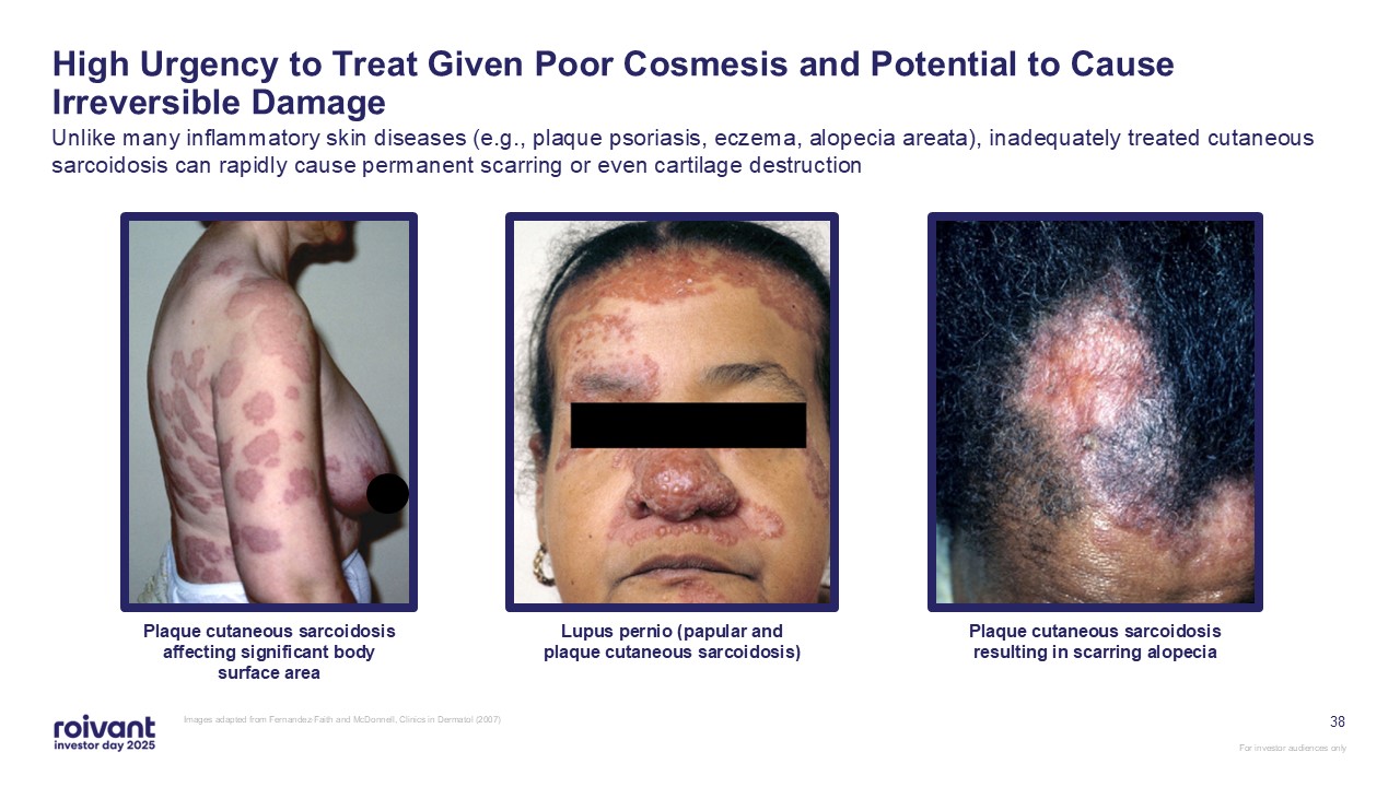 38  High Urgency to Treat Given Poor Cosmesis and Potential to Cause Irreversible Damage  Unlike many inflammatory skin diseases (e.g., plaque psoriasis, eczema, alopecia areata), inadequately treated cutaneous sarcoidosis can rapidly cause permanent scarring or even cartilage destruction  Images adapted from Fernandez-Faith and McDonnell, Clinics in Dermatol (2007)  Plaque cutaneous sarcoidosis affecting significant body surface area  Lupus pernio (papular and plaque cutaneous sarcoidosis)  Plaque cutaneous sarcoidosis resulting in scarring alopecia