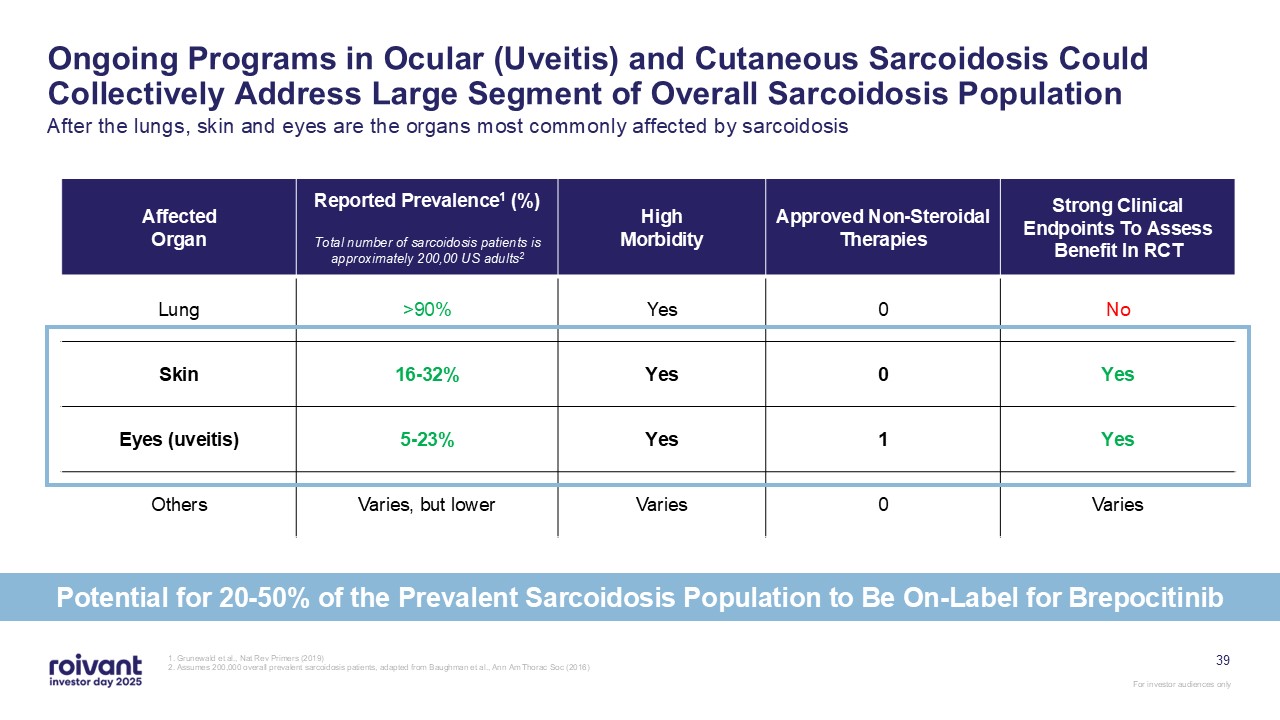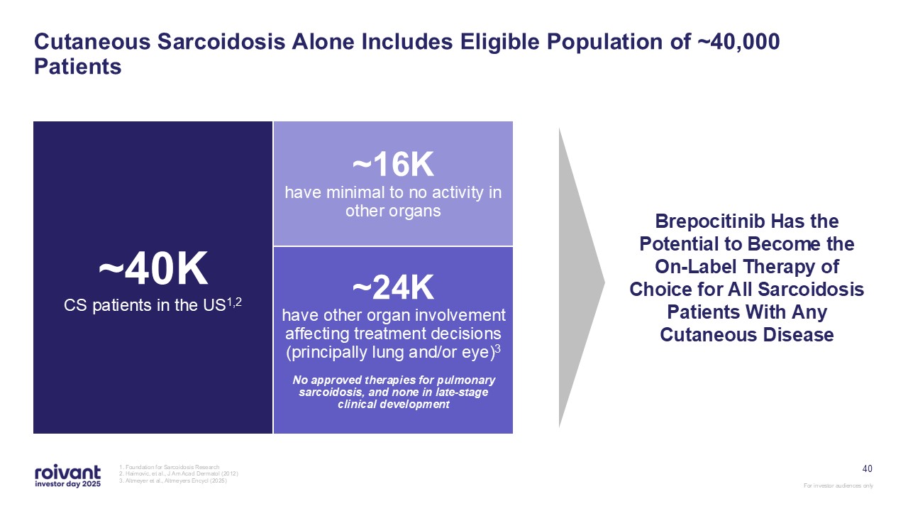 39  Ongoing Programs in Ocular (Uveitis) and Cutaneous Sarcoidosis Could Collectively Address Large Segment of Overall Sarcoidosis Population  After the lungs, skin and eyes are the organs most commonly affected by sarcoidosis  1. Grunewald et al., Nat Rev Primers (2019)  2. Assumes 200,000 overall prevalent sarcoidosis patients, adapted from Baughman et al., Ann Am Thorac Soc (2016)  Affected   Organ  Reported Prevalence1 (%)  Total number of sarcoidosis patients is approximately 200,00 US adults2  High   Morbidity  Approved Non-Steroidal Therapies  Strong Clinical Endpoints To Assess Benefit In RCT  Lung  >90%  Yes  0  No  Skin  16-32%  Yes  0  Yes  Eyes (uveitis)  5-23%  Yes  1  Yes  Others  Varies, but lower  Varies  0  Varies  Potential for 20-50% of the Prevalent Sarcoidosis Population to Be On-Label for Brepocitinib