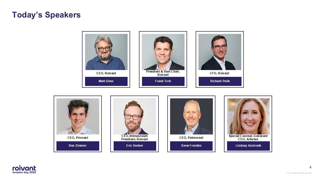 Today’s Speakers  Matt Gline  CEO, Roivant  Ben Zimmer  CEO, Priovant  Drew Fromkin  CEO, Pulmovant  Richard Pulik  CFO, Roivant  Frank Torti  President & Vant Chair, Roivant  4  CEO, Immunovant President, Roivant  Eric Venker  Lindsay Androski  Special Counsel, Genevant  CEO, Arbutus