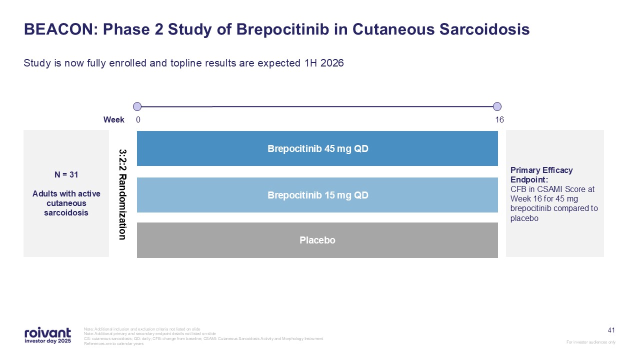 40  Cutaneous Sarcoidosis Alone Includes Eligible Population of ~40,000 Patients  1. Foundation for Sarcoidosis Research   2. Haimovic, et al., J Am Acad Dermatol (2012)   3. Altmeyer et al., Altmeyers Encycl (2025)  ~40K   CS patients in the US1,2  ~16K  have minimal to no activity in other organs  ~24K  have other organ involvement affecting treatment decisions (principally lung and/or eye)3  No approved therapies for pulmonary sarcoidosis, and none in late-stage clinical development   Brepocitinib Has the Potential to Become the On-Label Therapy of Choice for All Sarcoidosis Patients With Any Cutaneous Disease
