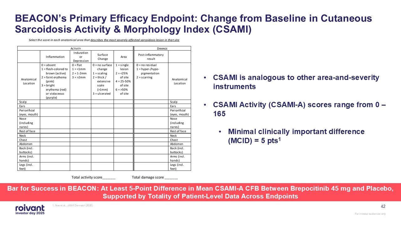 41  BEACON: Phase 2 Study of Brepocitinib in Cutaneous Sarcoidosis  Study is now fully enrolled and topline results are expected 1H 2026  Note: Additional inclusion and exclusion criteria not listed on slide  Note: Additional primary and secondary endpoint details not listed on slide  CS: cutaneous sarcoidosis; QD: daily; CFB: change from baseline; CSAMI: Cutaneous Sarcoidosis Activity and Morphology Instrument   References are to calendar years     N = 31  Adults with active cutaneous sarcoidosis  16  Placebo  Brepocitinib 45 mg QD  Brepocitinib 15 mg QD  Week  0  Primary Efficacy Endpoint:   CFB in CSAMI Score at Week 16 for 45 mg brepocitinib compared to placebo  3:2:2 Randomization