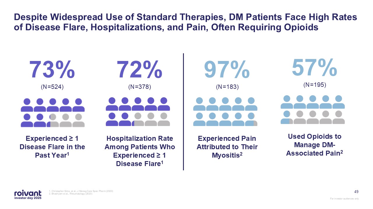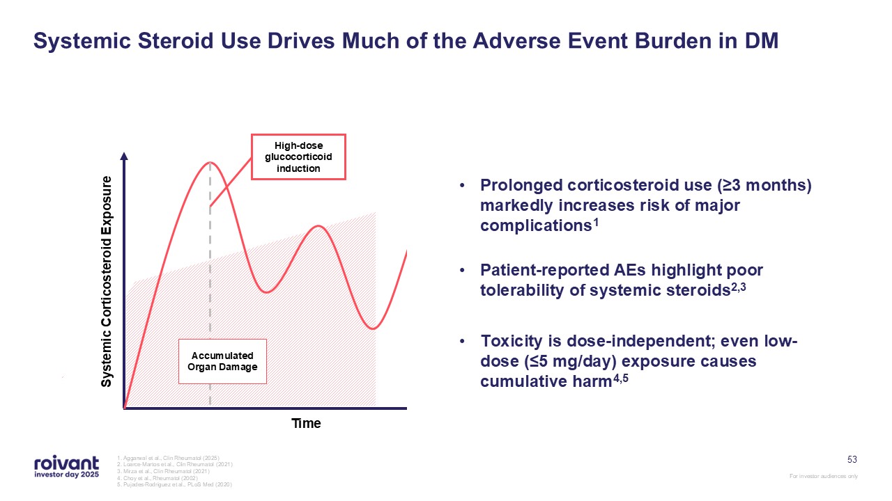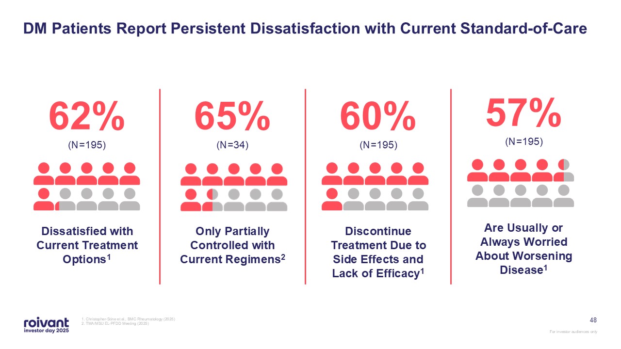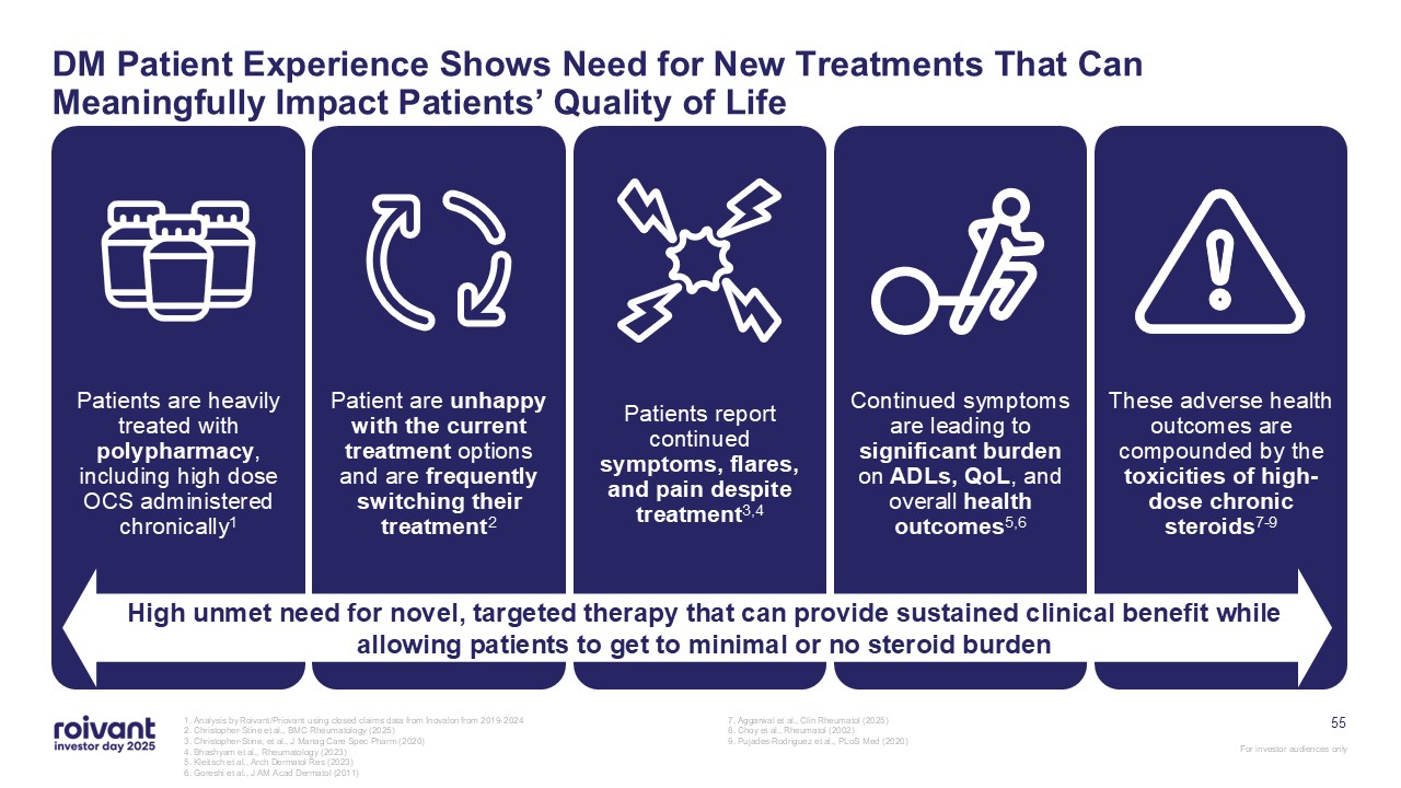 Patients are heavily treated with polypharmacy, including high dose OCS administered chronically1  Patient are unhappy with the current treatment options and are frequently switching their treatment2  Patients report continued symptoms, flares, and pain despite treatment3,4  Continued symptoms are leading to significant burden on ADLs, QoL, and overall health outcomes5,6  These adverse health outcomes are compounded by the toxicities of high-dose chronic steroids7-9  High unmet need for novel, targeted therapy that can provide sustained clinical benefit while allowing patients to get to minimal or no steroid burden  55  DM Patient Experience Shows Need for New Treatments That Can Meaningfully Impact Patients’ Quality of Life  1. Analysis by Roivant/Priovant using closed claims data from Inovalon from 2019-2024  2. Christopher-Stine et al., BMC Rheumatology (2025)  3. Christopher-Stine, et al., J Manag Care Spec Pharm (2020)  4. Bhashyam et al., Rheumatology (2023)  5. Kleitsch et al., Arch Dermatol Res (2023)  6. Goreshi et al., J AM Acad Dermatol (2011)  7. Aggarwal et al., Clin Rheumatol (2025)  8. Choy et al., Rheumatol (2002)  9. Pujades-Rodriguez et al., PLoS Med (2020)