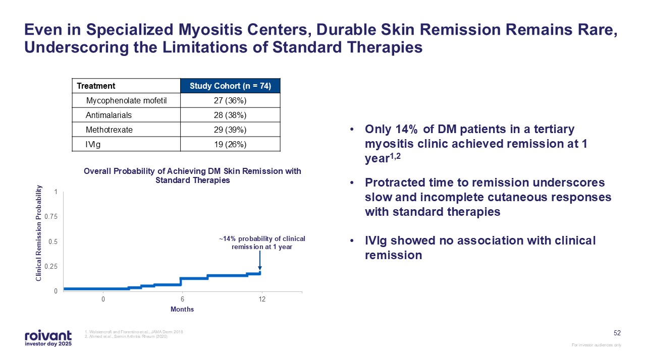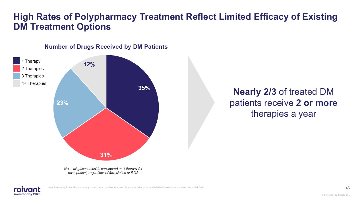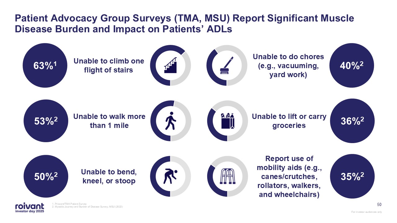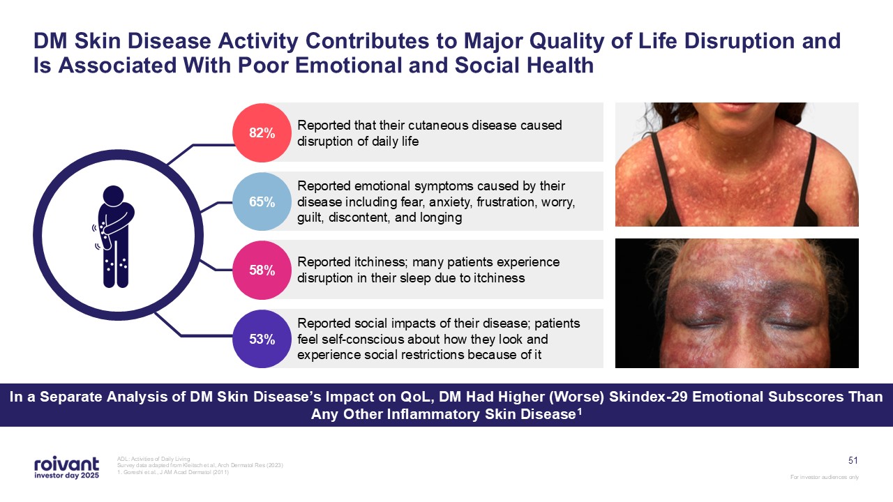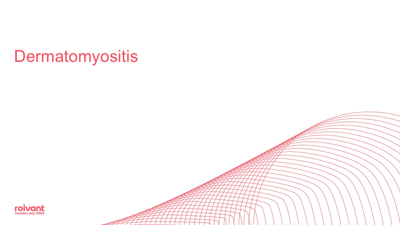 Patients are heavily treated with polypharmacy, including high dose OCS administered chronically1  Patient are unhappy with the current treatment options and are frequently switching their treatment2  Patients report continued symptoms, flares, and pain despite treatment3,4  Continued symptoms are leading to significant burden on ADLs, QoL, and overall health outcomes5,6  These adverse health outcomes are compounded by the toxicities of high-dose chronic steroids7-9  High unmet need for novel, targeted therapy that can provide sustained clinical benefit while allowing patients to get to minimal or no steroid burden  55  DM Patient Experience Shows Need for New Treatments That Can Meaningfully Impact Patients’ Quality of Life  1. Analysis by Roivant/Priovant using closed claims data from Inovalon from 2019-2024  2. Christopher-Stine et al., BMC Rheumatology (2025)  3. Christopher-Stine, et al., J Manag Care Spec Pharm (2020)  4. Bhashyam et al., Rheumatology (2023)  5. Kleitsch et al., Arch Dermatol Res (2023)  6. Goreshi et al., J AM Acad Dermatol (2011)  7. Aggarwal et al., Clin Rheumatol (2025)  8. Choy et al., Rheumatol (2002)  9. Pujades-Rodriguez et al., PLoS Med (2020)