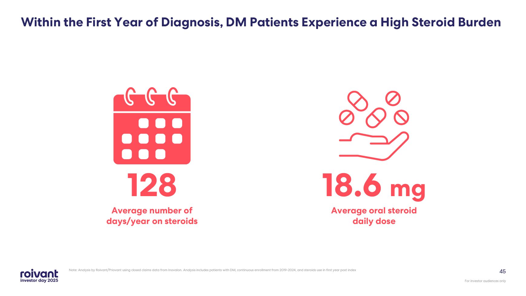 45  Within the First Year of Diagnosis, DM Patients Experience a High Steroid Burden   Note: Analysis by Roivant/Priovant using closed claims data from Inovalon. Analysis includes patients with DM, continuous enrollment from 2019-2024, and steroids use in first year post index  128  Average number of days/year on steroids  18.6 mg  Average oral steroid daily dose