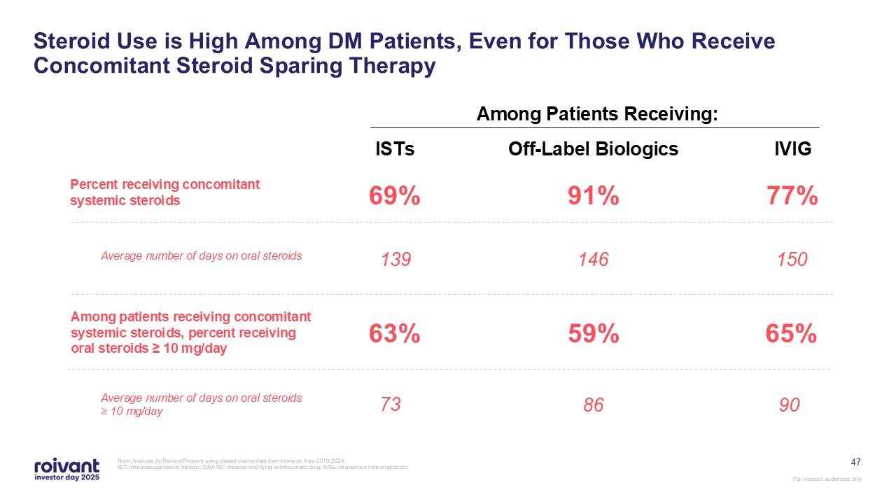 47  Steroid Use is High Among DM Patients, Even for Those Who Receive Concomitant Steroid Sparing Therapy  Note: Analysis by Roivant/Priovant using closed claims data from Inovalon from 2019-2024.   IST: immunosuppressive therapy; DMARD: disease-modifying antirheumatic drug; IVIG: intravenous immunoglobulin  Among Patients Receiving:  ISTs  69%   139   63%   Off-Label Biologics  91%   146  59%   IVIG  77%   150  65%   Percent receiving concomitant systemic steroids  Average number of days on oral steroids  Among patients receiving concomitant systemic steroids, percent receiving oral steroids ≥ 10 mg/day  Average number of days on oral steroids ≥ 10 mg/day  73  86  90