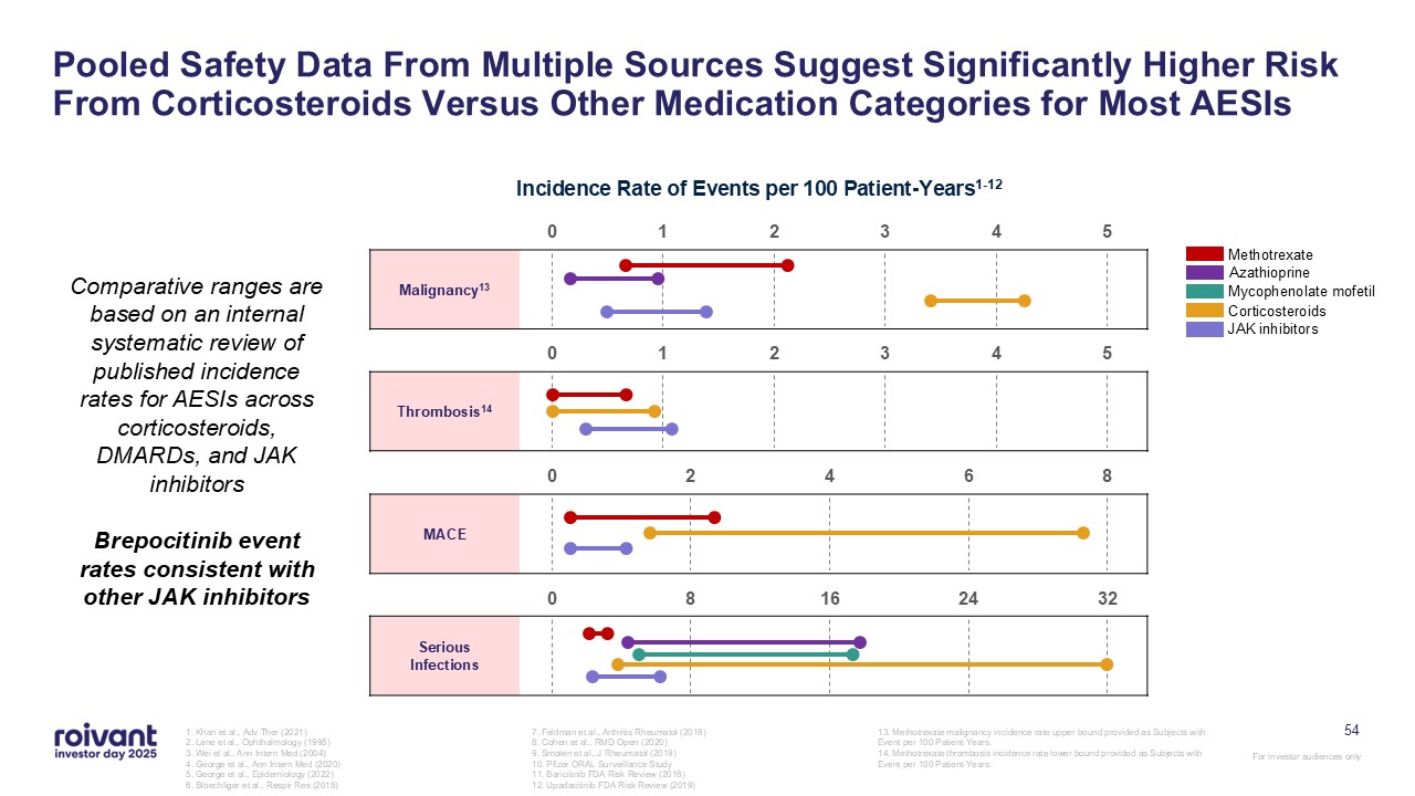 54  Pooled Safety Data From Multiple Sources Suggest Significantly Higher Risk From Corticosteroids Versus Other Medication Categories for Most AESIs  1. Khan et al., Adv Ther (2021)  2. Lane et al., Ophthalmology (1995)  3. Wei et al., Ann Intern Med (2004)  4. George et al., Ann Intern Med (2020)  5. George et al., Epidemiology (2022)  6. Bloechliger et al., Respir Res (2018)  7. Feldman et al., Arthritis Rheumatol (2018)  8. Cohen et al., RMD Open (2020)  9. Smolen et al., J Rheumatol (2019)  10. Pfizer ORAL Surveillance Study  11. Baricitinib FDA Risk Review (2018)  12. Upadacitinib FDA Risk Review (2019)  13. Methotrexate malignancy incidence rate upper bound provided as Subjects with Event per 100 Patient-Years.  14. Methotrexate thrombosis incidence rate lower bound provided as Subjects with Event per 100 Patient-Years.  Serious Infections  MACE  Thrombosis14  Malignancy13  Methotrexate  Azathioprine  Mycophenolate mofetil  Corticosteroids  JAK inhibitors  Incidence Rate of Events per 100 Patient-Years1-12  Comparative ranges are based on an internal systematic review of published incidence rates for AESIs across corticosteroids, DMARDs, and JAK inhibitors   Brepocitinib event rates consistent with other JAK inhibitors