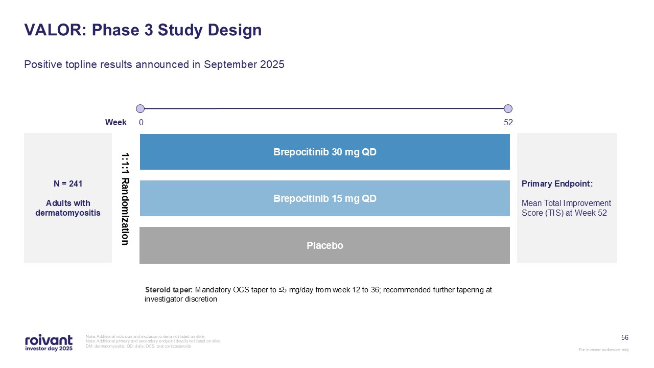 56  VALOR: Phase 3 Study Design  Positive topline results announced in September 2025  Note: Additional inclusion and exclusion criteria not listed on slide  Note: Additional primary and secondary endpoint details not listed on slide  DM: dermatomyositis; QD: daily; OCS: oral corticosteroids  N = 241  Adults with dermatomyositis  1:1:1 Randomization  Placebo  Brepocitinib 30 mg QD  Brepocitinib 15 mg QD  Week  0  52  Primary Endpoint:   Mean Total Improvement Score (TIS) at Week 52  Steroid taper: Mandatory OCS taper to ≤5 mg/day from week 12 to 36; recommended further tapering at investigator discretion
