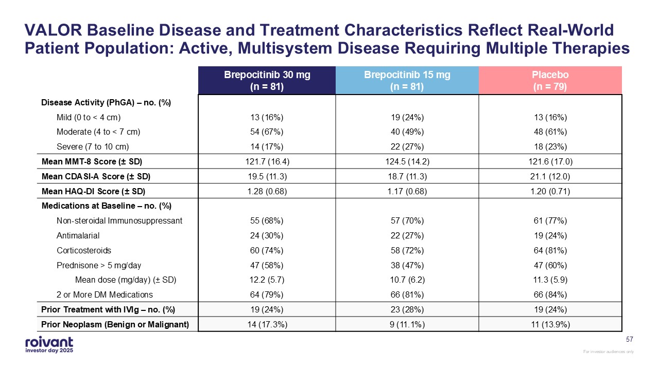 57  VALOR Baseline Disease and Treatment Characteristics Reflect Real-World Patient Population: Active, Multisystem Disease Requiring Multiple Therapies  Brepocitinib 30 mg(n = 81)  Brepocitinib 15 mg(n = 81)  Placebo(n = 79)  Disease Activity (PhGA) – no. (%)  Mild (0 to < 4 cm)  13 (16%)  19 (24%)  13 (16%)  Moderate (4 to < 7 cm)  54 (67%)  40 (49%)  48 (61%)  Severe (7 to 10 cm)  14 (17%)  22 (27%)  18 (23%)  Mean MMT-8 Score (± SD)  121.7 (16.4)  124.5 (14.2)  121.6 (17.0)  Mean CDASI-A Score (± SD)  19.5 (11.3)  18.7 (11.3)  21.1 (12.0)  Mean HAQ-DI Score (± SD)  1.28 (0.68)  1.17 (0.68)  1.20 (0.71)  Medications at Baseline – no. (%)  Non-steroidal Immunosuppressant  55 (68%)  57 (70%)  61 (77%)  Antimalarial  24 (30%)  22 (27%)  19 (24%)  Corticosteroids  60 (74%)  58 (72%)  64 (81%)  Prednisone > 5 mg/day  47 (58%)  38 (47%)  47 (60%)  Mean dose (mg/day) (± SD)  12.2 (5.7)  10.7 (6.2)  11.3 (5.9)  2 or More DM Medications  64 (79%)  66 (81%)  66 (84%)  Prior Treatment with IVIg – no. (%)  19 (24%)  23 (28%)  19 (24%)  Prior Neoplasm (Benign or Malignant)  14 (17.3%)  9 (11.1%)  11 (13.9%)