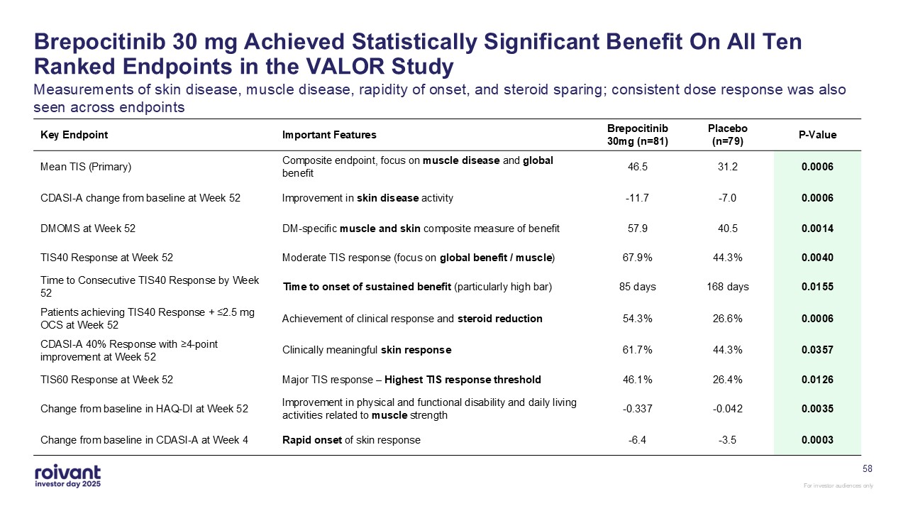 Brepocitinib 30 mg Achieved Statistically Significant Benefit On All Ten Ranked Endpoints in the VALOR Study  Measurements of skin disease, muscle disease, rapidity of onset, and steroid sparing; consistent dose response was also seen across endpoints  Key Endpoint  Important Features  Brepocitinib 30mg (n=81)  Placebo  (n=79)  P-Value  Mean TIS (Primary)  Composite endpoint, focus on muscle disease and global benefit  46.5  31.2  0.0006  CDASI-A change from baseline at Week 52   Improvement in skin disease activity  -11.7  -7.0  0.0006  DMOMS at Week 52  DM-specific muscle and skin composite measure of benefit  57.9  40.5  0.0014  TIS40 Response at Week 52  Moderate TIS response (focus on global benefit / muscle)  67.9%  44.3%  0.0040  Time to Consecutive TIS40 Response by Week 52  Time to onset of sustained benefit (particularly high bar)  85 days  168 days  0.0155  Patients achieving TIS40 Response + ≤2.5 mg OCS at Week 52  Achievement of clinical response and steroid reduction  54.3%  26.6%  0.0006  CDASI-A 40% Response with ≥4-point improvement at Week 52  Clinically meaningful skin response  61.7%  44.3%  0.0357  TIS60 Response at Week 52  Major TIS response – Highest TIS response threshold  46.1%  26.4%  0.0126  Change from baseline in HAQ-DI at Week 52   Improvement in physical and functional disability and daily living activities related to muscle strength   -0.337  -0.042  0.0035  Change from baseline in CDASI-A at Week 4  Rapid onset of skin response  -6.4  -3.5  0.0003  58
