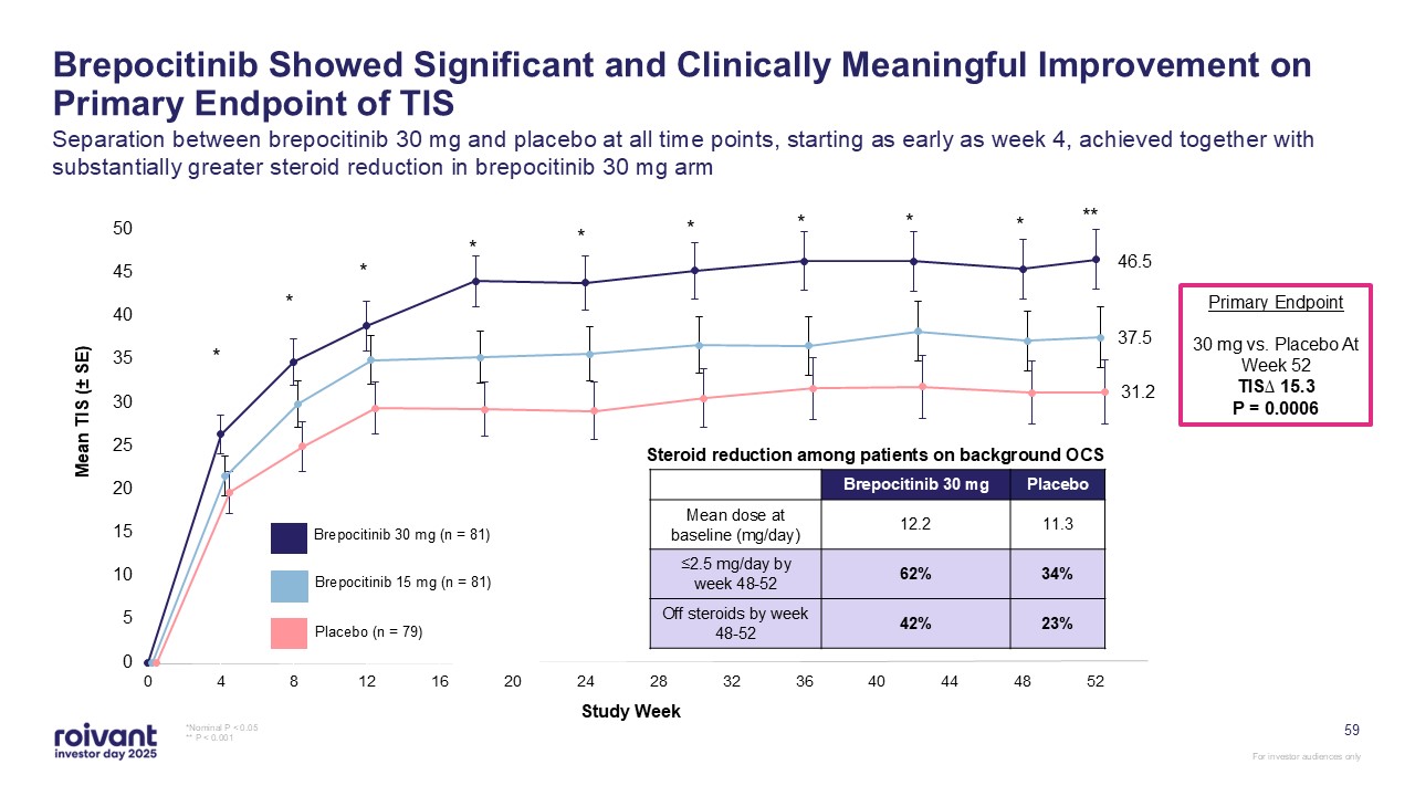 Brepocitinib Showed Significant and Clinically Meaningful Improvement on Primary Endpoint of TIS  Separation between brepocitinib 30 mg and placebo at all time points, starting as early as week 4, achieved together with substantially greater steroid reduction in brepocitinib 30 mg arm  *Nominal P < 0.05  ** P < 0.001  Brepocitinib 30 mg (n = 81)  Brepocitinib 15 mg (n = 81)  Placebo (n = 79)  Study Week  *  *  *  *  *  *  *  *  *  **  46.5  37.5  31.2  Primary Endpoint  30 mg vs. Placebo At Week 52   TIS∆ 15.3   P = 0.0006  Brepocitinib 30 mg  Placebo  Mean dose at baseline (mg/day)  12.2  11.3  ≤2.5 mg/day by week 48-52  62%  34%  Off steroids by week 48-52  42%  23%  Steroid reduction among patients on background OCS   59