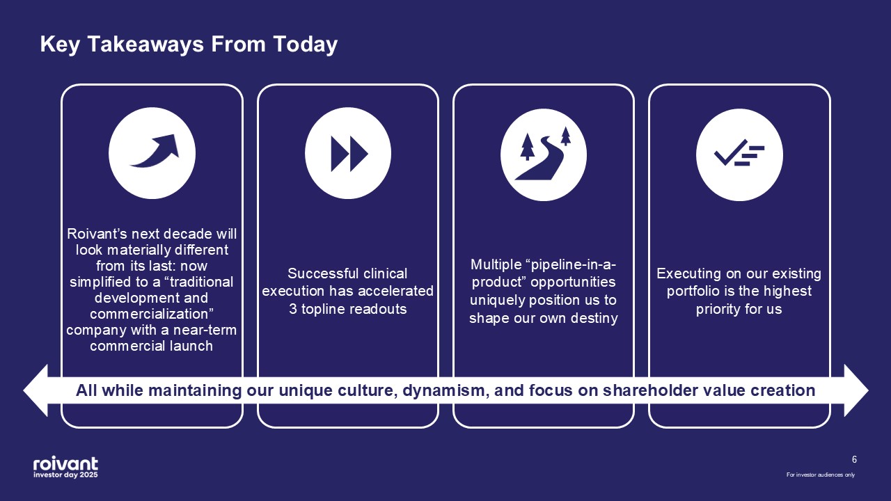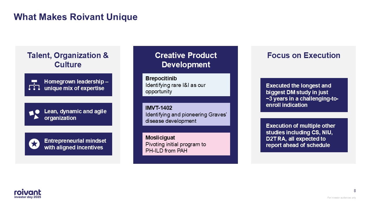 7  Combination of Capital, Expertise and Track Record Maximizes Value for Patients, Partners and Shareholders  1. Consolidated cash, cash equivalents, marketable securities, and other current assets as of September 30, 2025. Does not include $200M in non-ROIV gross proceeds from Immunovant’s December 2025 offering.   2. FDA approval and trial figures include Vants transferred to Sumitomo Pharma in December 2019, as well as Dermavant, which was acquired by Organon in October 2024   3. 148.6M shares were purchased for $1.5BN at an average price of $10.09  Note: All drugs are investigational and subject to regulatory approvals. All catalyst timings are approximate, based on current expectations and, where applicable, contingent on FDA feedback, and may be subject to change. All references are to calendar years  Significant Financial Strength  Proven Performance & Strong Pipeline   Focus on Capital Efficiency  8FDA Approvals2  12Positive Phase 3   Studies2  3Commercial Launches   Over the Next 3 Years  >$10BNin Exits to Pharma  $4.4BN cash & equivalents1; funded into profitability  Repurchased $1.5BN at ~$103; additional $500M authorized