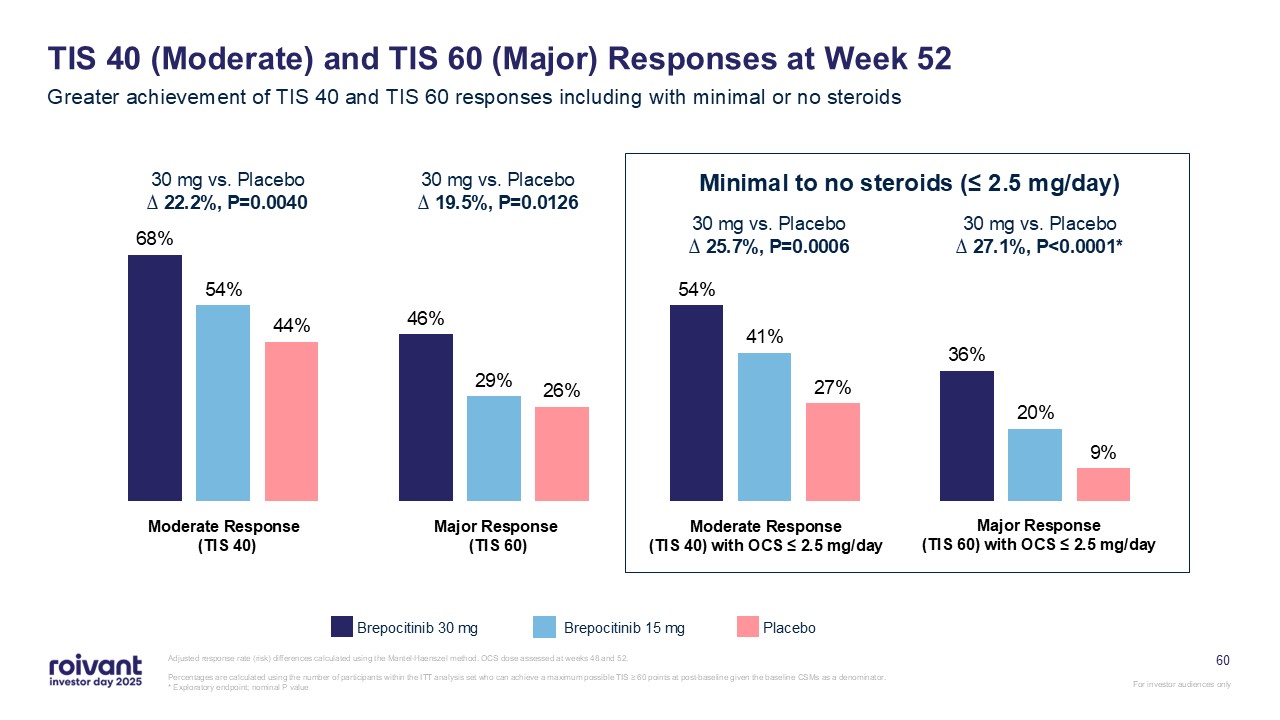 60  TIS 40 (Moderate) and TIS 60 (Major) Responses at Week 52  Greater achievement of TIS 40 and TIS 60 responses including with minimal or no steroids  Adjusted response rate (risk) differences calculated using the Mantel-Haenszel method. OCS dose assessed at weeks 48 and 52.  Percentages are calculated using the number of participants within the ITT analysis set who can achieve a maximum possible TIS ≥ 60 points at post-baseline given the baseline CSMs as a denominator.* Exploratory endpoint; nominal P value  Brepocitinib 30 mg   Brepocitinib 15 mg  Placebo  30 mg vs. Placebo∆ 22.2%, P=0.0040  30 mg vs. Placebo∆ 19.5%, P=0.0126  30 mg vs. Placebo∆ 25.7%, P=0.0006  30 mg vs. Placebo∆ 27.1%, P<0.0001*  Minimal to no steroids (≤ 2.5 mg/day)  Moderate Response (TIS 40)  Major Response (TIS 60)  Moderate Response (TIS 40) with OCS ≤ 2.5 mg/day   Major Response (TIS 60) with OCS ≤ 2.5 mg/day