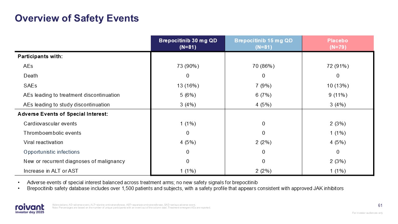 61  Overview of Safety Events  Abbreviations: AE=adverse event, ALT=alanine aminotransferase, AST=aspartate aminotransferase, SAE=serious adverse event.  Note: Percentages are based on the number of unique participants with an event out of the column total. Treatment-emergent AEs are reported.  Brepocitinib 30 mg QD(N=81)  Brepocitinib 15 mg QD(N=81)  Placebo(N=79)  Participants with:   AEs  73 (90%)  70 (86%)  72 (91%)   Death  0  0  0   SAEs  13 (16%)  7 (9%)  10 (13%)   AEs leading to treatment discontinuation  5 (6%)  6 (7%)  9 (11%)   AEs leading to study discontinuation  3 (4%)  4 (5%)  3 (4%)  Adverse Events of Special Interest:   Cardiovascular events  1 (1%)  0  2 (3%)   Thromboembolic events  0  0  1 (1%)   Viral reactivation  4 (5%)  2 (2%)  4 (5%)   Opportunistic infections  0  0  0   New or recurrent diagnoses of malignancy  0  0  2 (3%)   Increase in ALT or AST  1 (1%)  2 (2%)  1 (1%)  Adverse events of special interest balanced across treatment arms; no new safety signals for brepocitinib  Brepocitinib safety database includes over 1,500 patients and subjects, with a safety profile that appears consistent with approved JAK inhibitors