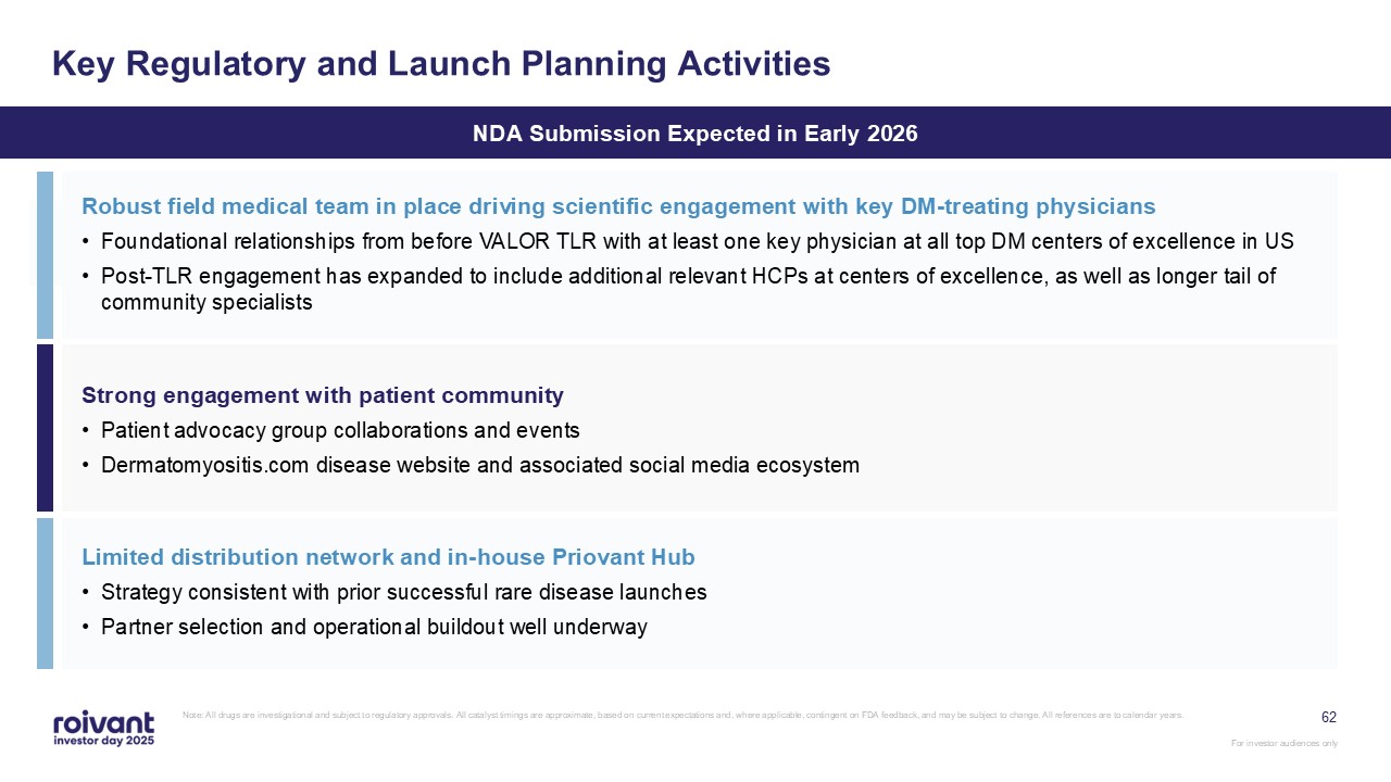 Key Regulatory and Launch Planning Activities  Strong engagement with patient community  Patient advocacy group collaborations and events  Dermatomyositis.com disease website and associated social media ecosystem  Limited distribution network and in-house Priovant Hub  Strategy consistent with prior successful rare disease launches  Partner selection and operational buildout well underway  Robust field medical team in place driving scientific engagement with key DM-treating physicians  Foundational relationships from before VALOR TLR with at least one key physician at all top DM centers of excellence in US  Post-TLR engagement has expanded to include additional relevant HCPs at centers of excellence, as well as longer tail of community specialists  NDA Submission Expected in Early 2026  62  Note: All drugs are investigational and subject to regulatory approvals. All catalyst timings are approximate, based on current expectations and, where applicable, contingent on FDA feedback, and may be subject to change. All references are to calendar years.