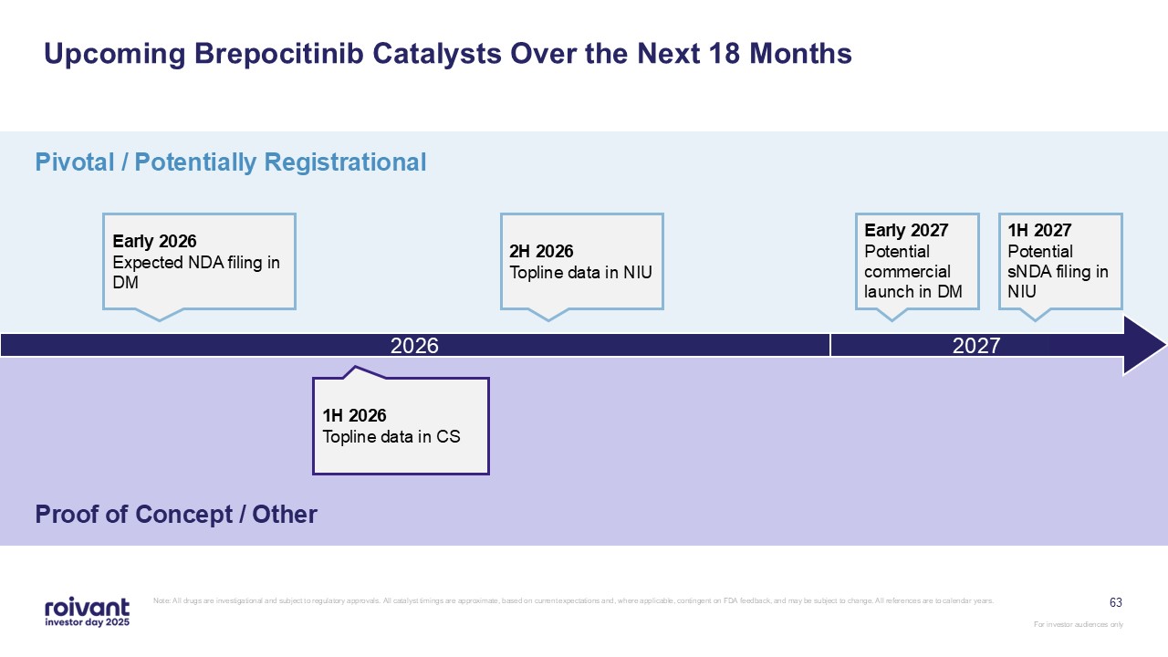 Upcoming Brepocitinib Catalysts Over the Next 18 Months  Pivotal / Potentially Registrational  Proof of Concept / Other  Early 2026  Expected NDA filing in DM  2026  2H 2026  Topline data in NIU  1H 2027  Potential sNDA filing in NIU  1H 2026  Topline data in CS  63  2027  Early 2027  Potential commercial launch in DM   Note: All drugs are investigational and subject to regulatory approvals. All catalyst timings are approximate, based on current expectations and, where applicable, contingent on FDA feedback, and may be subject to change. All references are to calendar years.