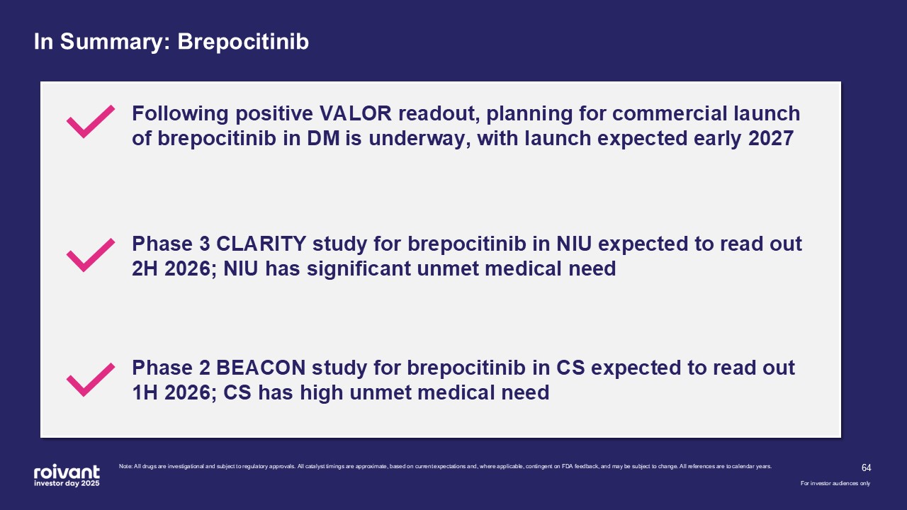 64  In Summary: Brepocitinib  Phase 2 BEACON study for brepocitinib in CS expected to read out 1H 2026; CS has high unmet medical need  Following positive VALOR readout, planning for commercial launch of brepocitinib in DM is underway, with launch expected early 2027  Note: All drugs are investigational and subject to regulatory approvals. All catalyst timings are approximate, based on current expectations and, where applicable, contingent on FDA feedback, and may be subject to change. All references are to calendar years.  Phase 3 CLARITY study for brepocitinib in NIU expected to read out 2H 2026; NIU has significant unmet medical need  For investor audiences only