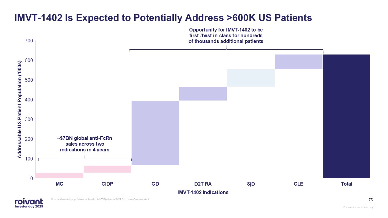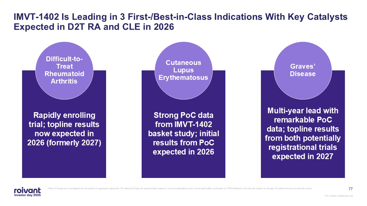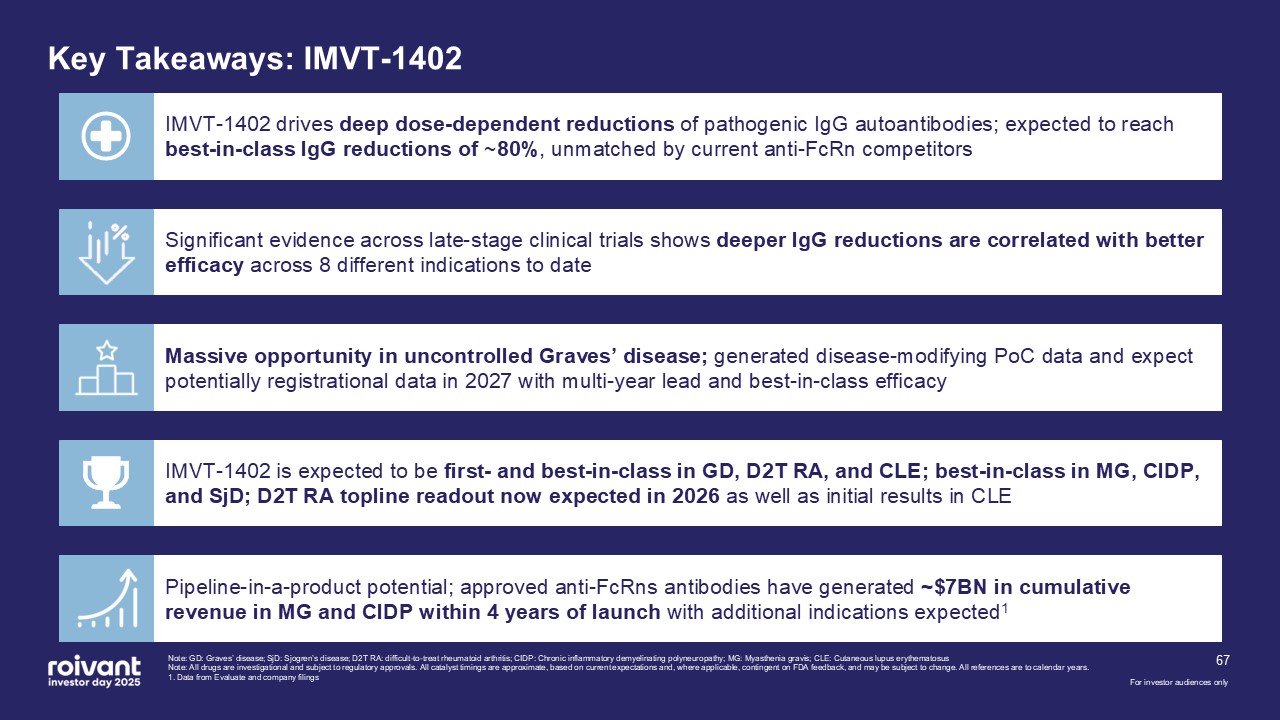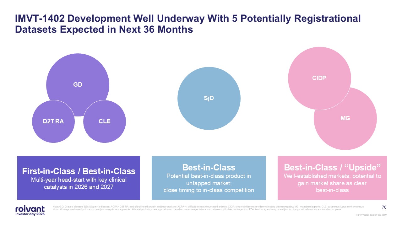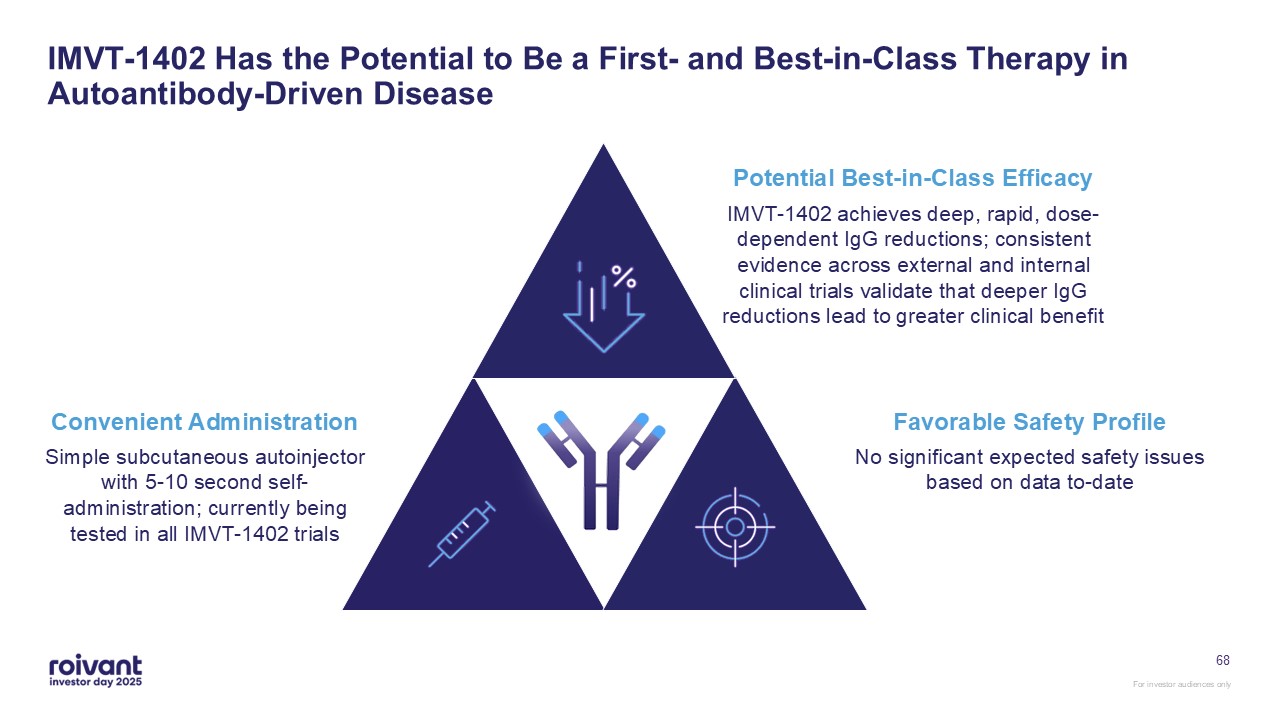 67  IMVT-1402 drives deep dose-dependent reductions of pathogenic IgG autoantibodies; expected to reach best-in-class IgG reductions of ~80%, unmatched by current anti-FcRn competitors  Pipeline-in-a-product potential; approved anti-FcRns antibodies have generated ~$7BN in cumulative revenue in MG and CIDP within 4 years of launch with additional indications expected1  Massive opportunity in uncontrolled Graves’ disease; generated disease-modifying PoC data and expect potentially registrational data in 2027 with multi-year lead and best-in-class efficacy  Significant evidence across late-stage clinical trials shows deeper IgG reductions are correlated with better efficacy across 8 different indications to date  IMVT-1402 is expected to be first- and best-in-class in GD, D2T RA, and CLE; best-in-class in MG, CIDP, and SjD; D2T RA topline readout now expected in 2026 as well as initial results in CLE  Key Takeaways: IMVT-1402  Note: GD: Graves’ disease; SjD: Sjogren’s disease; D2T RA: difficult-to-treat rheumatoid arthritis; CIDP: Chronic inflammatory demyelinating polyneuropathy; MG: Myasthenia gravis; CLE: Cutaneous lupus erythematosus  Note: All drugs are investigational and subject to regulatory approvals. All catalyst timings are approximate, based on current expectations and, where applicable, contingent on FDA feedback, and may be subject to change. All references are to calendar years.   1. Data from Evaluate and company filings  For investor audiences only