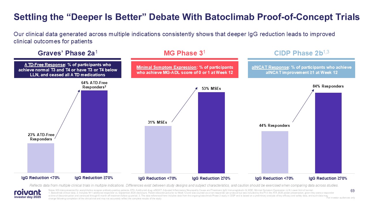 Settling the “Deeper Is Better” Debate With Batoclimab Proof-of-Concept Trials  Our clinical data generated across multiple indications consistently shows that deeper IgG reduction leads to improved clinical outcomes for patients  Graves’ Phase 2a1  MG Phase 31   CIDP Phase 2b1,3   ATD-Free Response: % of participants who achieve normal T3 and T4 or have T3 or T4 below LLN, and ceased all ATD medications  Minimal Symptom Expression: % of participants who achieve MG-ADL score of 0 or 1 at Week 12  aINCAT Response: % of participants who achieve aINCAT improvement ≥1 at Week 12  Reflects data from multiple clinical trials in multiple indications. Differences exist between study designs and subject characteristics, and caution should be exercised when comparing data across studies. ​  69  Notes: MG data presented for acetylcholine receptor antibody-positive patients; ATD: Antithyroid drug; aINCAT: Adjusted Inflammatory Neuropathy Cause and Treatment; IgG: Immunoglobulin G; MSE: Minimal Symptom Expression; LLN: Lower limit of normal.   1. Batoclimab clinical data. 2. Includes N=1 additional responder vs. September 2024 disclosure. Patient discontinued prior to Week 12 and was counted as a non-responder per protocol but was included by the PI in the ATA 2025 poster presentation, given they were a responder at time of discontinuation and continued through 6 month off-treatment follow-up period. 3. The data referenced here includes data from the ongoing batoclimab Phase 2 study in CIDP and is based on a preliminary analysis of key efficacy and safety data, and such data may change following completion of the clinical trial and may not accurately reflect the complete results of the study