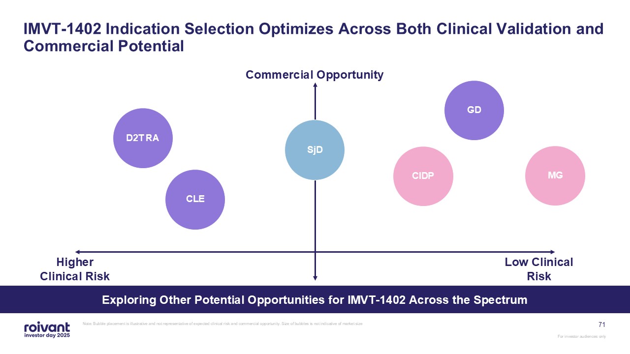 70  IMVT-1402 Development Well Underway With 5 Potentially Registrational Datasets Expected in Next 36 Months  Note: GD: Graves’ disease; SjD: Sjogren’s disease; ACPA+ D2T RA: anti-citrullinated protein antibody positive (ACPA+), difficult-to-treat rheumatoid arthritis; CIDP: chronic inflammatory demyelinating polyneuropathy; MG: myasthenia gravis; CLE: cutaneous lupus erythematosus   Note: All drugs are investigational and subject to regulatory approvals. All catalyst timings are approximate, based on current expectations and, where applicable, contingent on FDA feedback, and may be subject to change. All references are to calendar years.  MG  CIDP  SjD  GD  CLE  D2T RA  First-in-Class / Best-in-Class  Multi-year head-start with key clinical catalysts in 2026 and 2027  Best-in-Class  Potential best-in-class product in untapped market;  close timing to in-class competition  Best-in-Class / “Upside”  Well-established markets; potential to gain market share as clear best-in-class