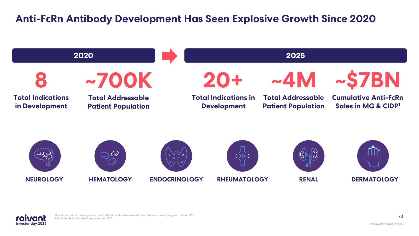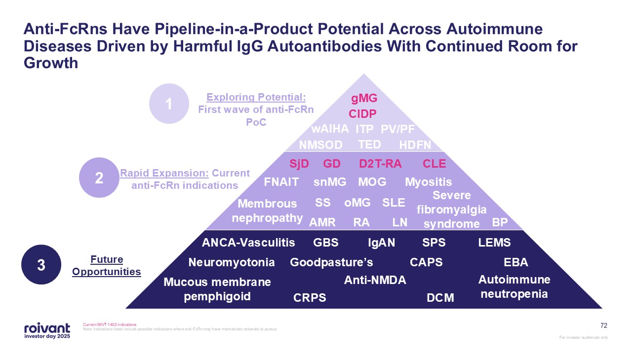 72  Anti-FcRns Have Pipeline-in-a-Product Potential Across Autoimmune Diseases Driven by Harmful IgG Autoantibodies With Continued Room for Growth  Current IMVT-1402 indications  Note: Indications listed include possible indications where anti-FcRn may have mechanistic rationale to pursue  gMG  CIDP  wAIHA  ITP  PV/PF  TED  HDFN  NMSOD  MOG  snMG  GD  oMG  FNAIT  D2T-RA  Myositis  SjD  RA  SLE  Severe fibromyalgia syndrome  BP  SS  AMR  LN  CLE  IgAN  GBS  CAPS  SPS  ANCA-Vasculitis  Neuromyotonia  Goodpasture’s  CRPS  Autoimmune neutropenia  EBA  Mucous membrane pemphigoid  LEMS  Anti-NMDA  DCM  Membrous nephropathy  Exploring Potential: First wave of anti-FcRn PoC  Future Opportunities   1  Rapid Expansion: Current anti-FcRn indications  2  3