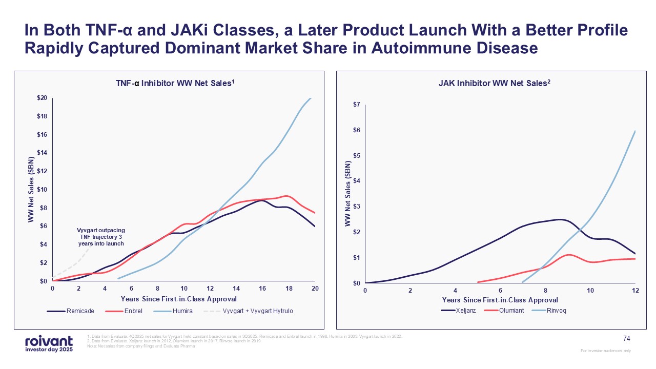 In Both TNF-α and JAKi Classes, a Later Product Launch With a Better Profile Rapidly Captured Dominant Market Share in Autoimmune Disease  1. Data from Evaluate. 4Q2025 net sales for Vyvgart held constant based on sales in 3Q2025. Remicade and Enbrel launch in 1998, Humira in 2003. Vyvgart launch in 2022.   2. Data from Evaluate. Xeljanz launch in 2012, Olumiant launch in 2017, Rinvoq launch in 2019  Note: Net sales from company filings and Evaluate Pharma  TNF-α Inhibitor WW Net Sales1  JAK Inhibitor WW Net Sales2  74  Vyvgart outpacing TNF trajectory 3 years into launch