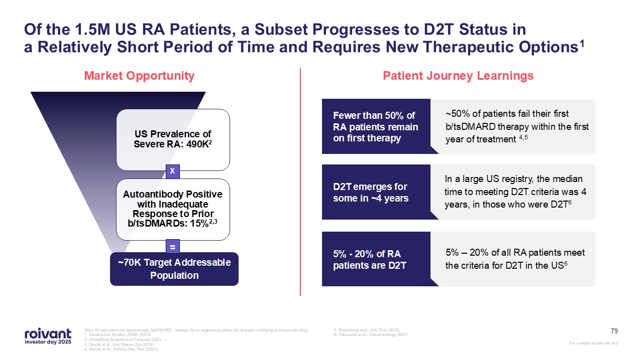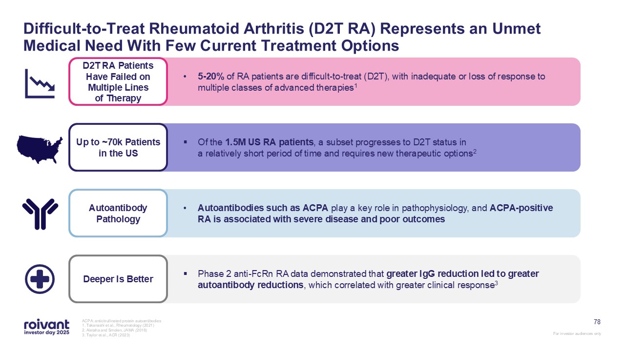 78  Difficult-to-Treat Rheumatoid Arthritis (D2T RA) Represents an Unmet Medical Need With Few Current Treatment Options  ACPA: anticitrullinated protein autoantibodies  1. Takanashi et al., Rheumatology (2021)  2. Aletaha and Smolen, JAMA (2018)   3. Taylor et al., ACR (2023)  Deeper Is Better  Phase 2 anti-FcRn RA data demonstrated that greater IgG reduction led to greater autoantibody reductions, which correlated with greater clinical response3  Up to ~70k Patients in the US  Of the 1.5M US RA patients, a subset progresses to D2T status ina relatively short period of time and requires new therapeutic options2   Autoantibody Pathology  Autoantibodies such as ACPA play a key role in pathophysiology, and ACPA-positive RA is associated with severe disease and poor outcomes  D2T RA Patients Have Failed on Multiple Lines of Therapy  5-20% of RA patients are difficult-to-treat (D2T), with inadequate or loss of response to multiple classes of advanced therapies1