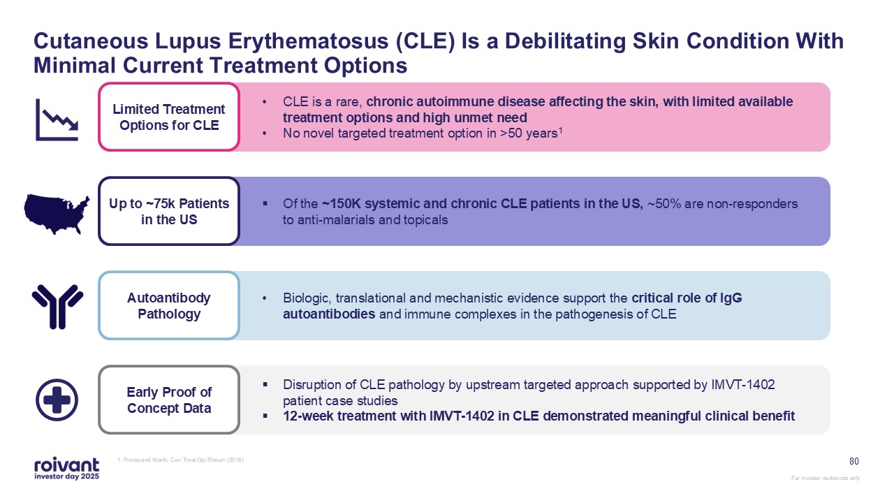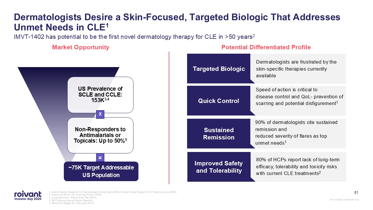 1. Internal Market Research CLE Dermatologist Unmet Need (2023), Internal Market Research CLE Patient Journey (2024)   2. Presto and Werth, Curr Treat Opt Rheum (2016)  3. Jarukitsopa et al., Arthritis Care Res (2015)  4. IMVT Spherix Internal Market Research   5. Wahie and Meggitt, Br J Dermatol (2013)  Dermatologists Desire a Skin-Focused, Targeted Biologic That Addresses Unmet Needs in CLE1  IMVT-1402 has potential to be the first novel dermatology therapy for CLE in >50 years2  Market Opportunity  Potential Differentiated Profile  Dermatologists are frustrated by the skin-specific therapies currently available  Targeted Biologic  Speed of action is critical to disease control and QoL- prevention of scarring and potential disfigurement1  Quick Control  90% of dermatologists cite sustained remission and reduced severity of flares as top unmet needs1  Sustained Remission  ~75K Target Addressable US Population  X  =  80% of HCPs report lack of long-term efficacy, tolerability and toxicity risks with current CLE treatments2  Improved Safety and Tolerability  81