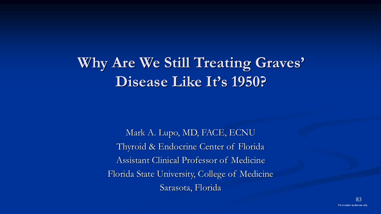 Why Are We Still Treating Graves’ Disease Like It’s 1950?  Mark A. Lupo, MD, FACE, ECNU  Thyroid & Endocrine Center of Florida  Assistant Clinical Professor of Medicine  Florida State University, College of Medicine  Sarasota, Florida  83  For investor audiences only