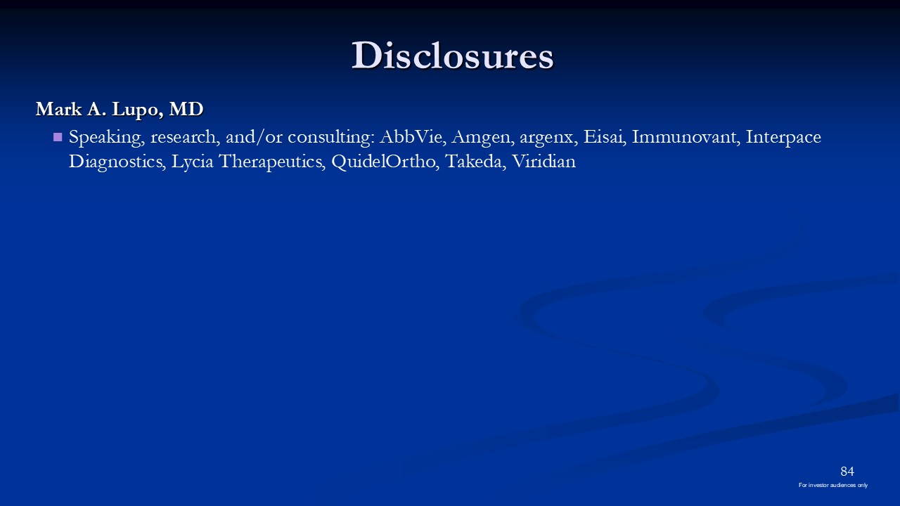 Disclosures   Mark A. Lupo, MD  Speaking, research, and/or consulting: AbbVie, Amgen, argenx, Eisai, Immunovant, Interpace Diagnostics, Lycia Therapeutics, QuidelOrtho, Takeda, Viridian  84  For investor audiences only