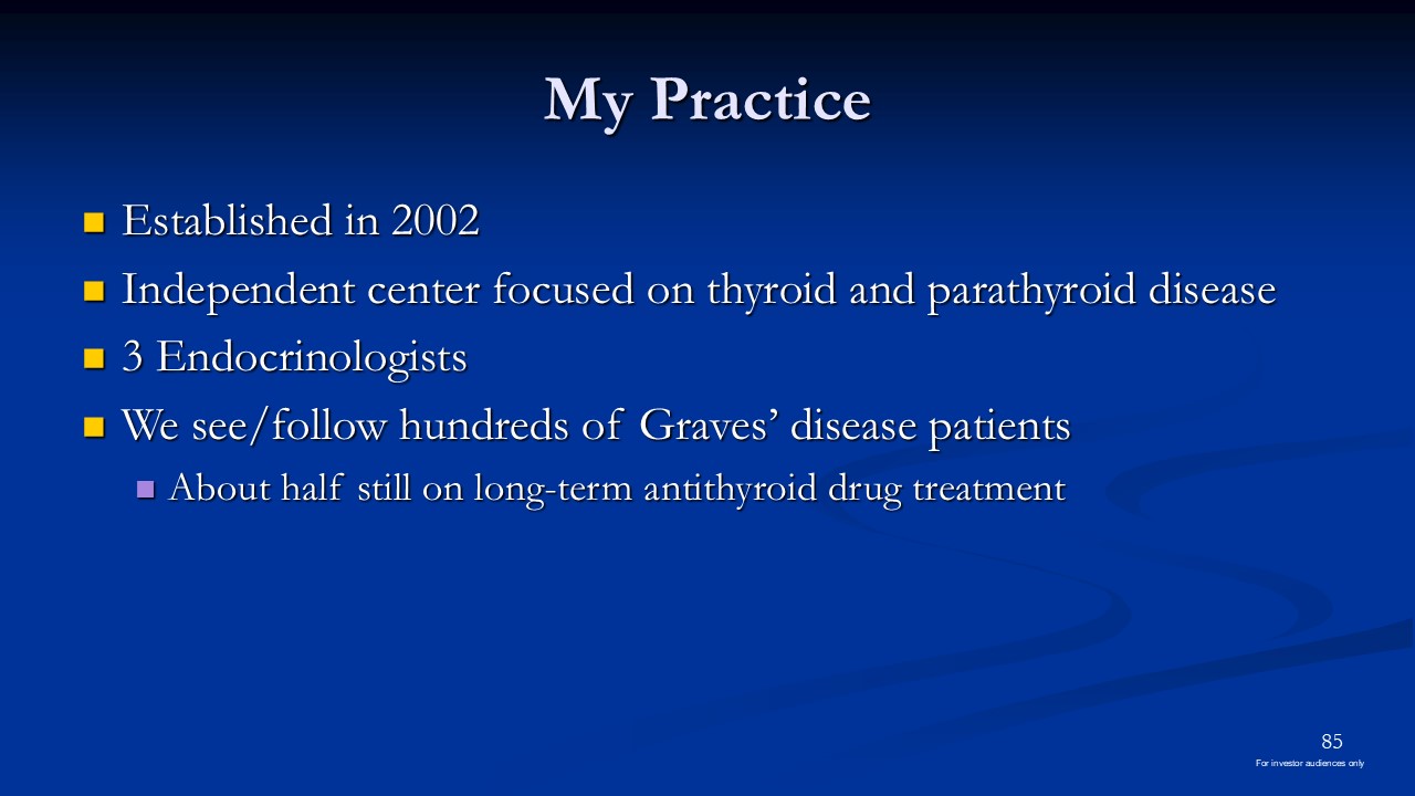 My Practice  Established in 2002  Independent center focused on thyroid and parathyroid disease  3 Endocrinologists  We see/follow hundreds of Graves’ disease patients  About half still on long-term antithyroid drug treatment  85  For investor audiences only