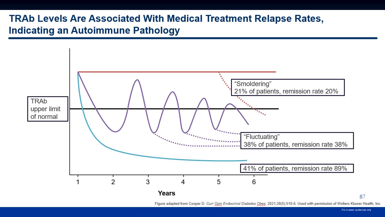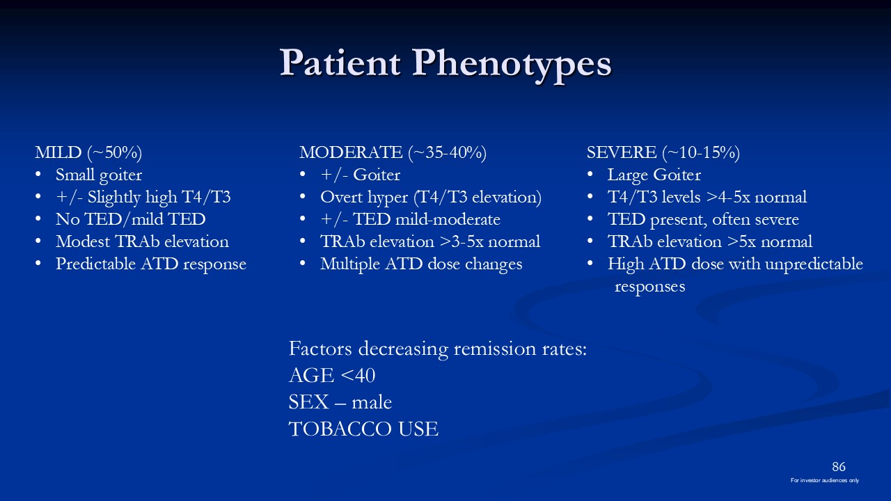 Patient Phenotypes  MILD (~50%)  Small goiter  +/- Slightly high T4/T3  No TED/mild TED  Modest TRAb elevation  Predictable ATD response  MODERATE (~35-40%)  +/- Goiter  Overt hyper (T4/T3 elevation)  +/- TED mild-moderate  TRAb elevation >3-5x normal  Multiple ATD dose changes  SEVERE (~10-15%)  Large Goiter  T4/T3 levels >4-5x normal  TED present, often severe  TRAb elevation >5x normal  High ATD dose with unpredictable   responses  Factors decreasing remission rates:  AGE <40  SEX – male  TOBACCO USE  86  For investor audiences only