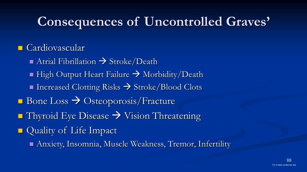 Consequences of Uncontrolled Graves’  Cardiovascular  Atrial Fibrillation  Stroke/Death  High Output Heart Failure  Morbidity/Death  Increased Clotting Risks  Stroke/Blood Clots  Bone Loss  Osteoporosis/Fracture  Thyroid Eye Disease  Vision Threatening  Quality of Life Impact  Anxiety, Insomnia, Muscle Weakness, Tremor, Infertility  88  For investor audiences only