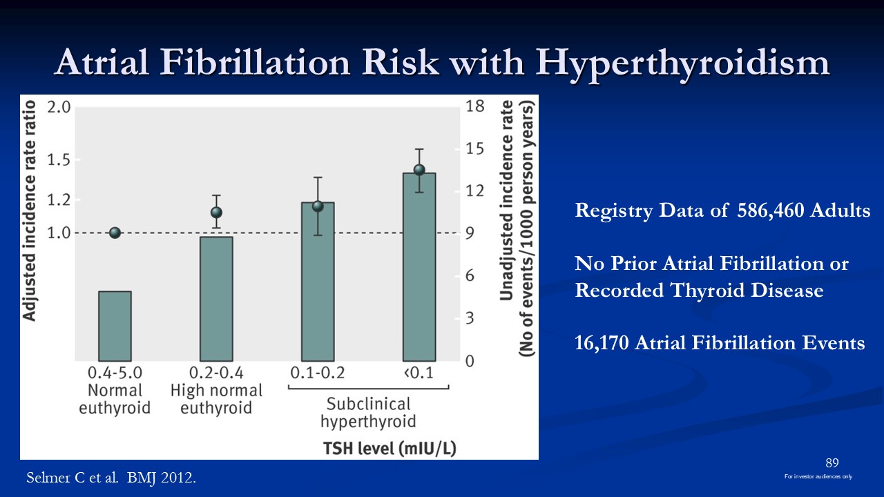 Atrial Fibrillation Risk with Hyperthyroidism  Registry Data of 586,460 Adults  No Prior Atrial Fibrillation or  Recorded Thyroid Disease  16,170 Atrial Fibrillation Events  Selmer C et al. BMJ 2012.  89  For investor audiences only