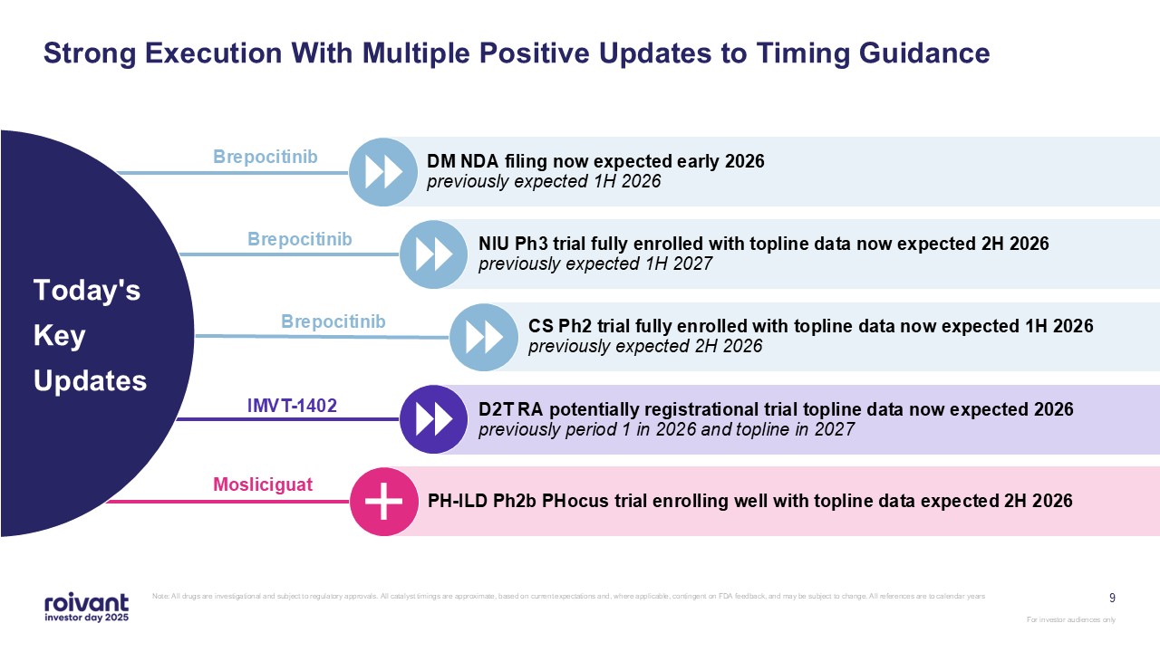 8  What Makes Roivant Unique  Entrepreneurial mindset with aligned incentives  Lean, dynamic and agile organization  Homegrown leadership – unique mix of expertise  Talent, Organization & Culture  Creative Product Development  Brepocitinib  Identifying rare I&I as our opportunity  IMVT-1402  Identifying and pioneering Graves’ disease development  Mosliciguat  Pivoting initial program to PH-ILD from PAH  Focus on Execution  Executed the longest and biggest DM study in just ~3 years in a challenging-to-enroll indication  Execution of multiple other studies including CS, NIU, D2T RA, all expected to report ahead of schedule
