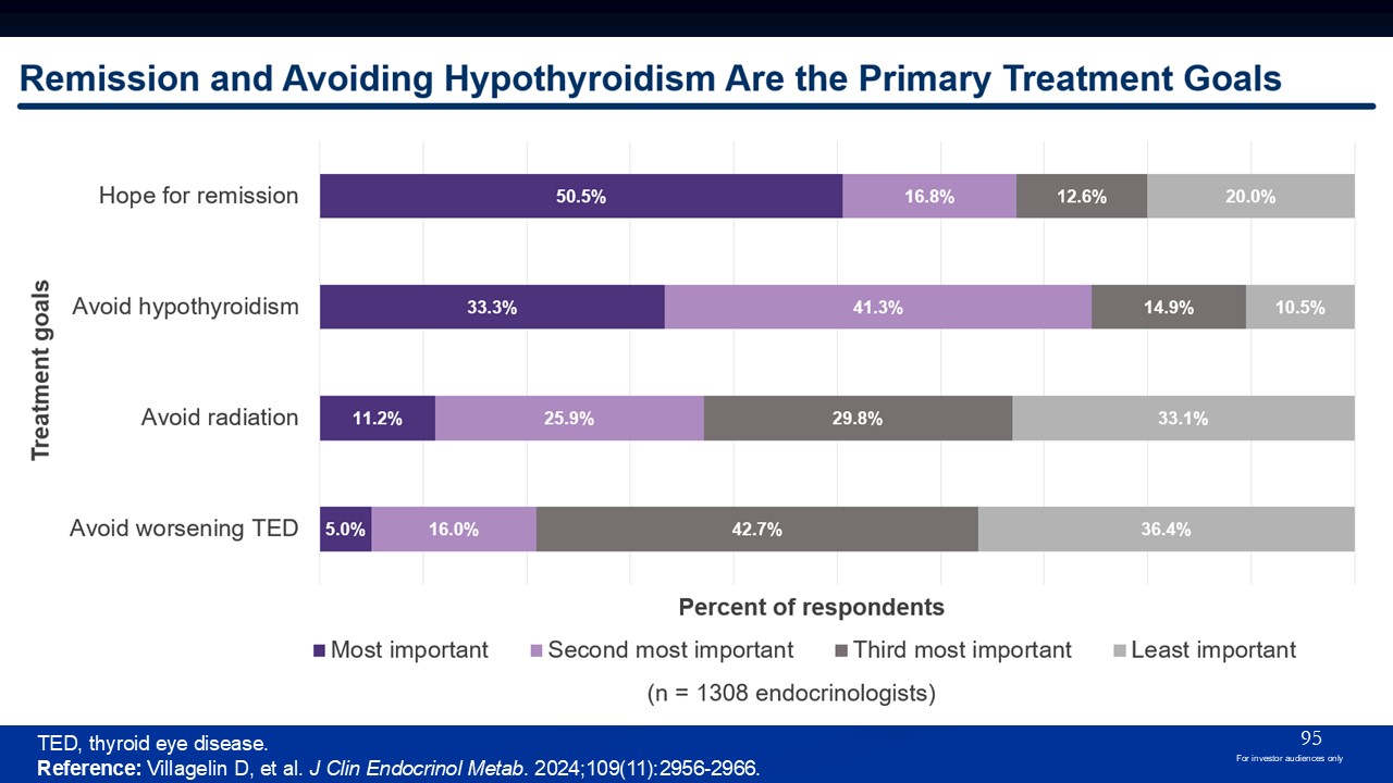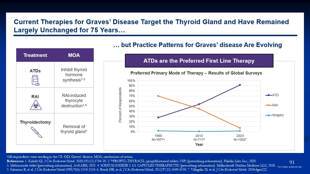 aAll respondents were residing in the US. GD, Graves’ disease; MOA, mechanism of action.   References: 1. Kahaly GJ. J Clin Endocrinol Metab. 2020;105(12):3704-20. 2. PrPROPYL-THYRACIL (propylthiouracil tablets USP) [prescribing information]. Paladin Labs Inc.; 2020.   3. Methimazole tablet [prescribing information]. AvKARE; 2025. 4. SODIUM IODIDE I 131 CAPSULES THERAPEUTIC [prescribing information]. Mallinckrodt Nuclear Medicine LLC; 2018.   5. Solomon B, et al. J Clin Endocrinol Metab.1990;70(6):1518-1524. 6. Burch HB, et al. J Clin Endocrinol Metab. 2012;97(12):4549-4558. 7. Villagelin D, et al. J Clin Endocrinol Metab. 2024:dgae222.   91  For investor audiences only