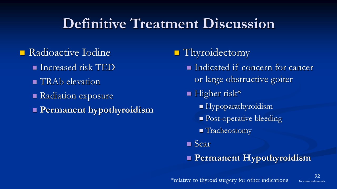 Definitive Treatment Discussion  Radioactive Iodine  Increased risk TED  TRAb elevation   Radiation exposure  Permanent hypothyroidism  Thyroidectomy  Indicated if concern for cancer or large obstructive goiter  Higher risk*  Hypoparathyroidism  Post-operative bleeding  Tracheostomy  Scar  Permanent Hypothyroidism  *relative to thyroid surgery for other indications  92  For investor audiences only