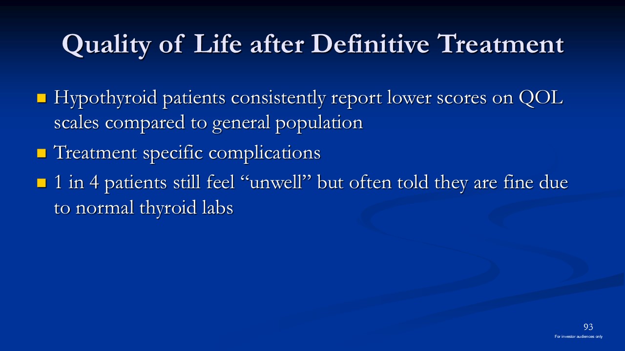 Quality of Life after Definitive Treatment  Hypothyroid patients consistently report lower scores on QOL scales compared to general population  Treatment specific complications  1 in 4 patients still feel “unwell” but often told they are fine due to normal thyroid labs  93  For investor audiences only