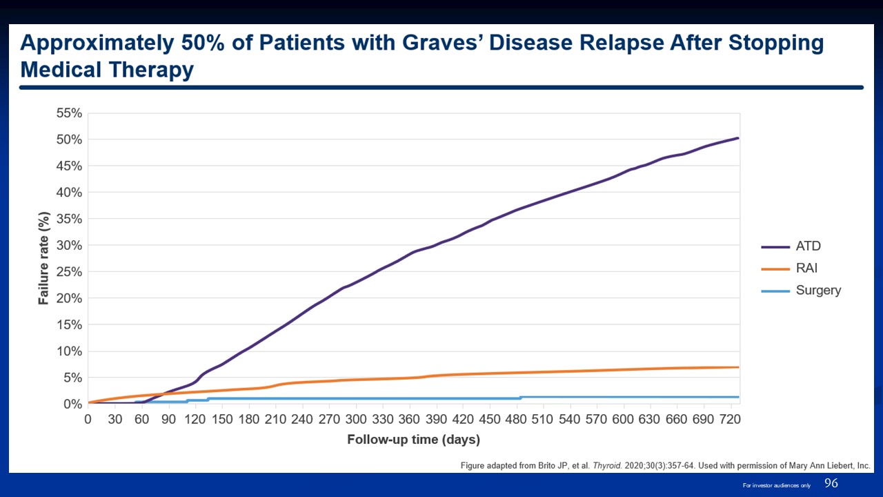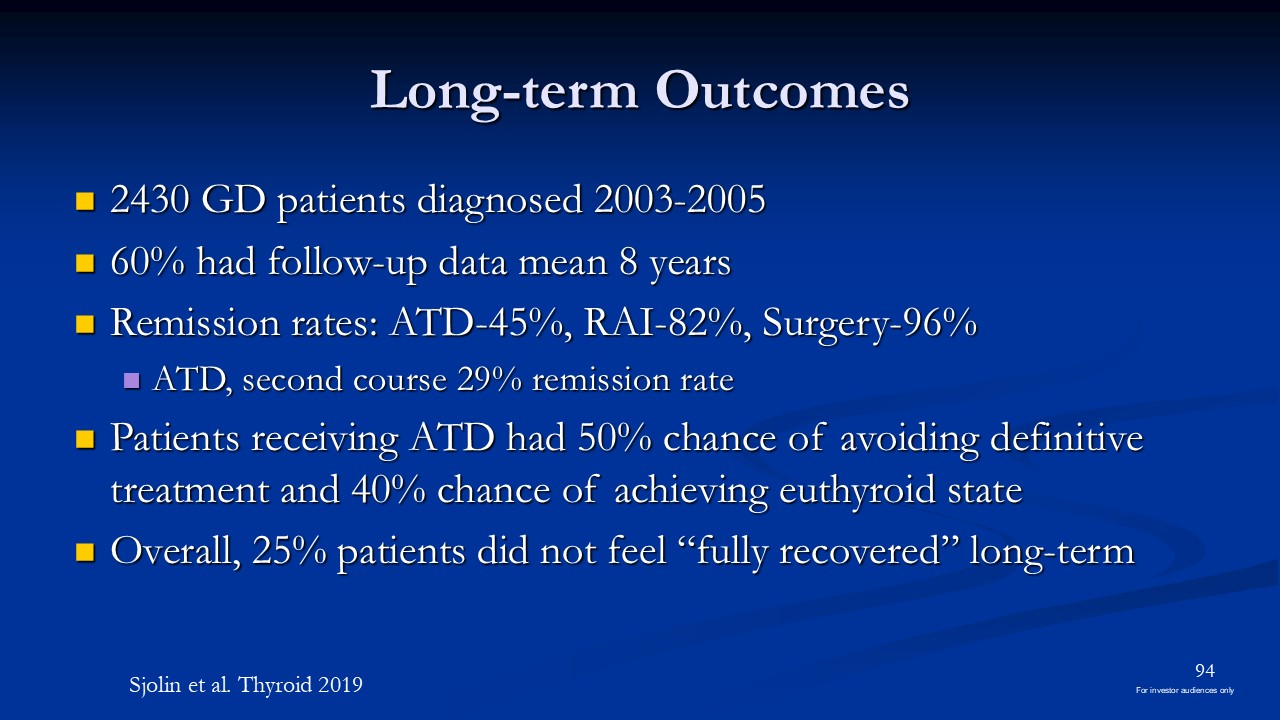 Long-term Outcomes  2430 GD patients diagnosed 2003-2005  60% had follow-up data mean 8 years   Remission rates: ATD-45%, RAI-82%, Surgery-96%  ATD, second course 29% remission rate  Patients receiving ATD had 50% chance of avoiding definitive treatment and 40% chance of achieving euthyroid state  Overall, 25% patients did not feel “fully recovered” long-term   Sjolin et al. Thyroid 2019  94  For investor audiences only