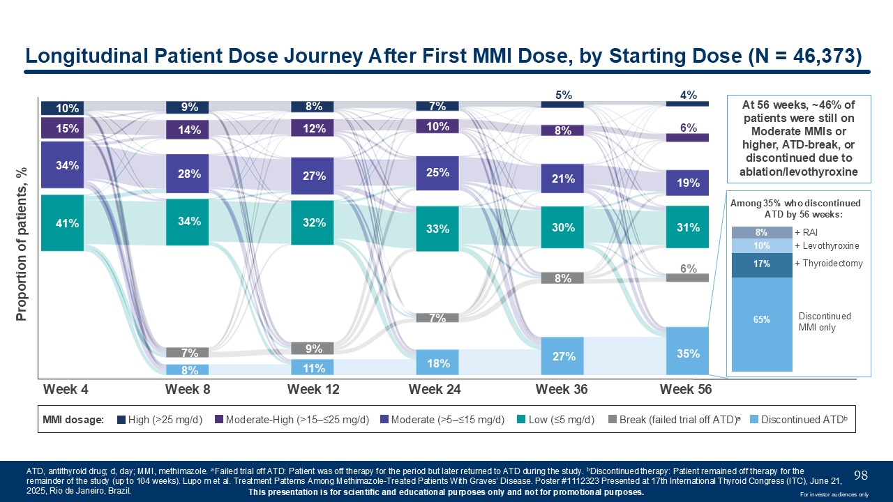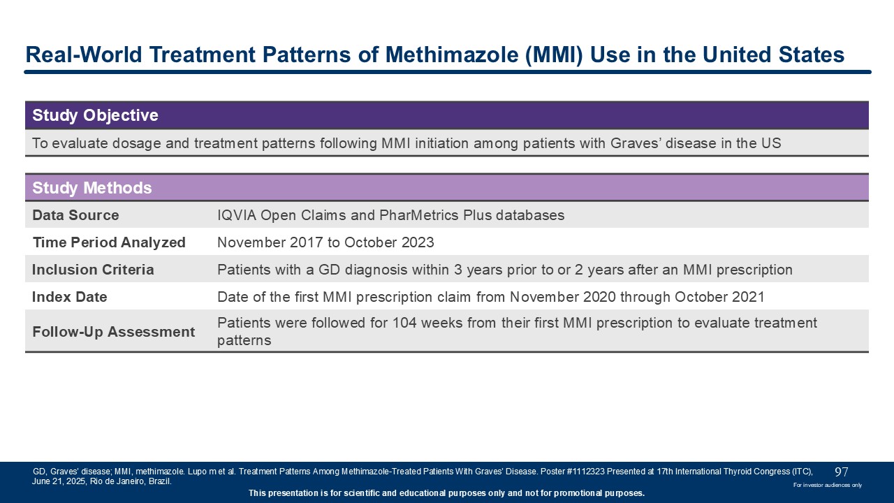 Real-World Treatment Patterns of Methimazole (MMI) Use in the United States  Study Methods  Data Source  IQVIA Open Claims and PharMetrics Plus databases  Time Period Analyzed   November 2017 to October 2023   Inclusion Criteria  Patients with a GD diagnosis within 3 years prior to or 2 years after an MMI prescription   Index Date  Date of the first MMI prescription claim from November 2020 through October 2021  Follow-Up Assessment  Patients were followed for 104 weeks from their first MMI prescription to evaluate treatment patterns  Study Objective  To evaluate dosage and treatment patterns following MMI initiation among patients with Graves’ disease in the US  GD, Graves’ disease; MMI, methimazole. Lupo m et al. Treatment Patterns Among Methimazole-Treated Patients With Graves’ Disease. Poster #1112323 Presented at 17th International Thyroid Congress (ITC), June 21, 2025, Rio de Janeiro, Brazil.   97  For investor audiences only