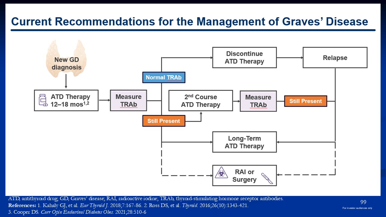 ATD, antithyroid drug; GD, Graves’ disease; RAI, radioactive iodine; TRAb, thyroid-stimulating hormone receptor antibodies.  References: 1. Kahaly GJ, et al. Eur Thyroid J. 2018;7:167-86. 2. Ross DS, et al. Thyroid. 2016;26(10):1343-421.   3. Cooper DS. Curr Opin Endocrinol Diabetes Obes. 2021;28:510-6  99  For investor audiences only