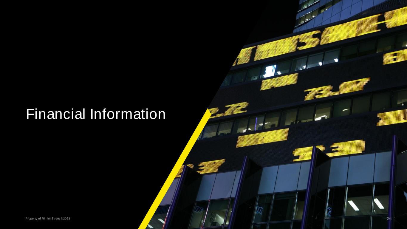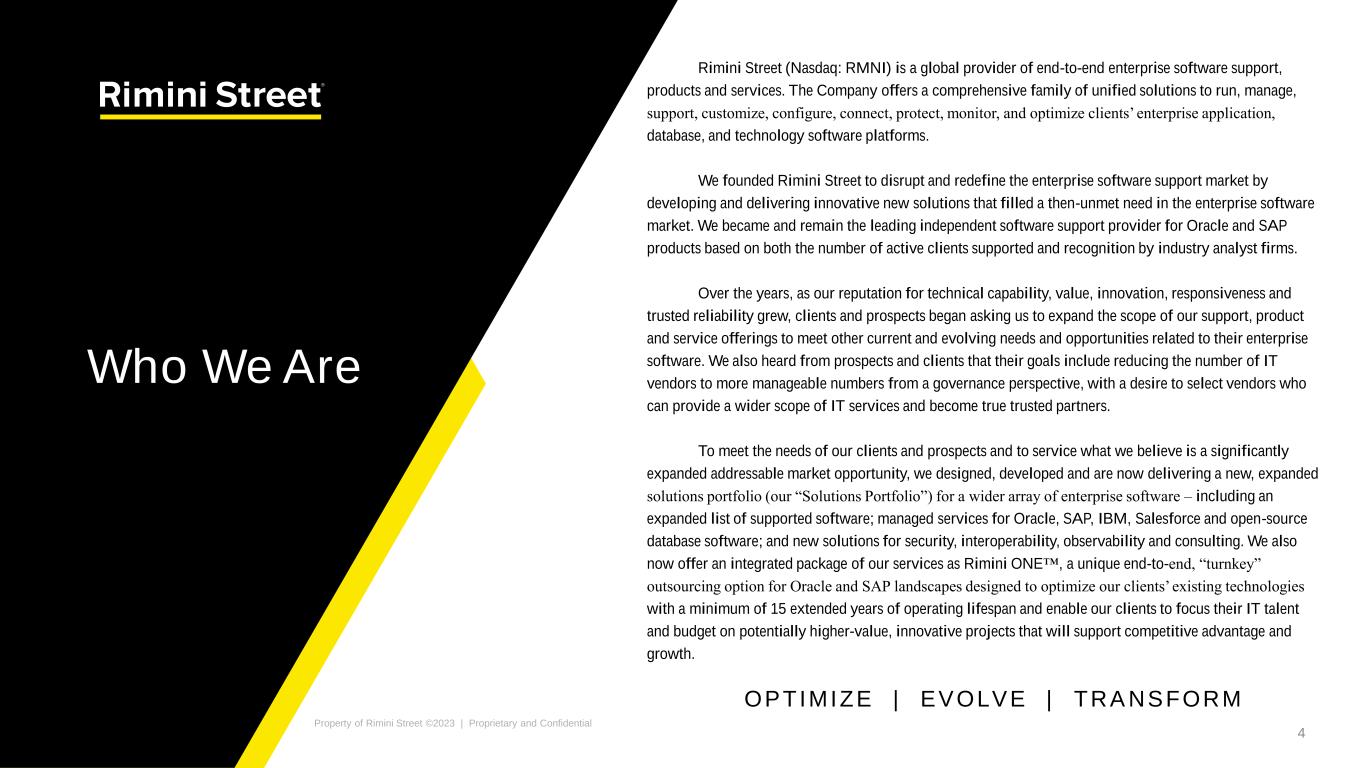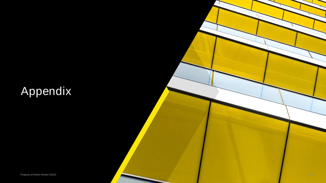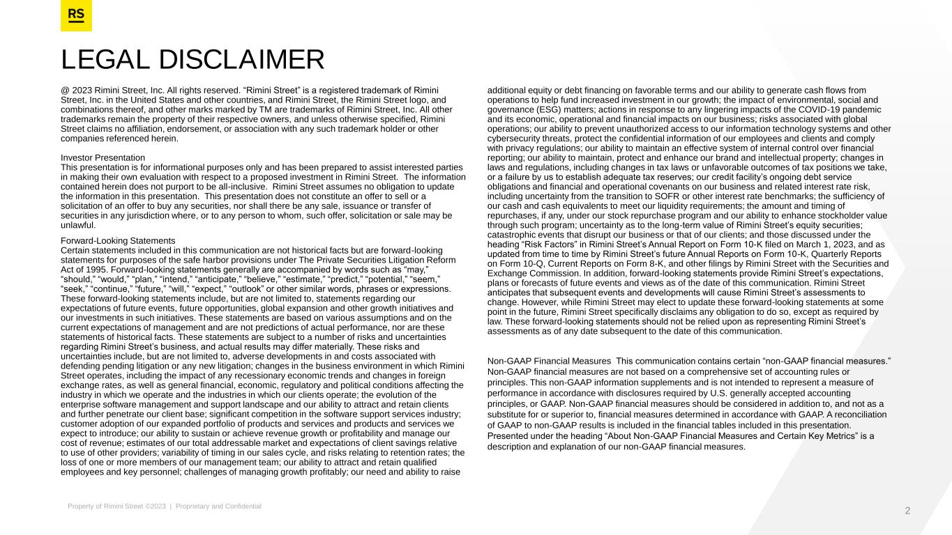 LEGAL DISCLAIMER @ 2023 Rimini Street, Inc. All rights reserved. “Rimini Street” is a registered trademark of Rimini Street, Inc. in the United States and other countries, and Rimini Street, the Rimini Street logo, and combinations thereof, and other marks marked by TM are trademarks of Rimini Street, Inc. All other trademarks remain the property of their respective owners, and unless otherwise specified, Rimini Street claims no affiliation, endorsement, or association with any such trademark holder or other companies referenced herein. Investor Presentation This presentation is for informational purposes only and has been prepared to assist interested parties in making their own evaluation with respect to a proposed investment in Rimini Street. The information contained herein does not purport to be all-inclusive. Rimini Street assumes no obligation to update the information in this presentation. This presentation does not constitute an offer to sell or a solicitation of an offer to buy any securities, nor shall there be any sale, issuance or transfer of securities in any jurisdiction where, or to any person to whom, such offer, solicitation or sale may be unlawful. Forward-Looking Statements Certain statements included in this communication are not historical facts but are forward-looking statements for purposes of the safe harbor provisions under The Private Securities Litigation Reform Act of 1995. Forward-looking statements generally are accompanied by words such as “may,” “should,” “would,” “plan,” “intend,” “anticipate,” “believe,” “estimate,” “predict,” “potential,” “seem,” “seek,” “continue,” “future,” “will,” “expect,” “outlook” or other similar words, phrases or expressions. These forward-looking statements include, but are not limited to, statements regarding our expectations of future events, future opportunities, global expansion and other growth initiatives and our investments in such initiatives. These statements are based on various assumptions and on the current expectations of management and are not predictions of actual performance, nor are these statements of historical facts. These statements are subject to a number of risks and uncertainties regarding Rimini Street’s business, and actual results may differ materially. These risks and uncertainties include, but are not limited to, adverse developments in and costs associated with defending pending litigation or any new litigation; changes in the business environment in which Rimini Street operates, including the impact of any recessionary economic trends and changes in foreign exchange rates, as well as general financial, economic, regulatory and political conditions affecting the industry in which we operate and the industries in which our clients operate; the evolution of the enterprise software management and support landscape and our ability to attract and retain clients and further penetrate our client base; significant competition in the software support services industry; customer adoption of our expanded portfolio of products and services and products and services we expect to introduce; our ability to sustain or achieve revenue growth or profitability and manage our cost of revenue; estimates of our total addressable market and expectations of client savings relative to use of other providers; variability of timing in our sales cycle, and risks relating to retention rates; the loss of one or more members of our management team; our ability to attract and retain qualified employees and key personnel; challenges of managing growth profitably; our need and ability to raise additional equity or debt financing on favorable terms and our ability to generate cash flows from operations to help fund increased investment in our growth; the impact of environmental, social and governance (ESG) matters; actions in response to any lingering impacts of the COVID-19 pandemic and its economic, operational and financial impacts on our business; risks associated with global operations; our ability to prevent unauthorized access to our information technology systems and other cybersecurity threats, protect the confidential information of our employees and clients and comply with privacy regulations; our ability to maintain an effective system of internal control over financial reporting; our ability to maintain, protect and enhance our brand and intellectual property; changes in laws and regulations, including changes in tax laws or unfavorable outcomes of tax positions we take, or a failure by us to establish adequate tax reserves; our credit facility’s ongoing debt service obligations and financial and operational covenants on our business and related interest rate risk, including uncertainty from the transition to SOFR or other interest rate benchmarks; the sufficiency of our cash and cash equivalents to meet our liquidity requirements; the amount and timing of repurchases, if any, under our stock repurchase program and our ability to enhance stockholder value through such program; uncertainty as to the long-term value of Rimini Street’s equity securities; catastrophic events that disrupt our business or that of our clients; and those discussed under the heading “Risk Factors” in Rimini Street’s Annual Report on Form 10-K filed on March 1, 2023, and as updated from time to time by Rimini Street’s future Annual Reports on Form 10-K, Quarterly Reports on Form 10-Q, Current Reports on Form 8-K, and other filings by Rimini Street with the Securities and Exchange Commission. In addition, forward-looking statements provide Rimini Street’s expectations, plans or forecasts of future events and views as of the date of this communication. Rimini Street anticipates that subsequent events and developments will cause Rimini Street’s assessments to change. However, while Rimini Street may elect to update these forward-looking statements at some poin