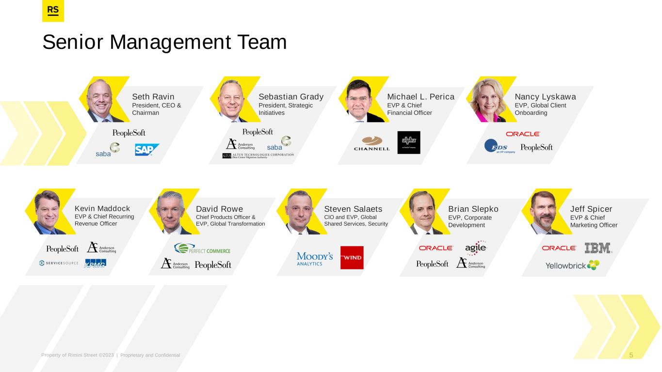 Who We Are Property of Rimini Street ©2023 | Proprietary and Confidential 4 OPTIMIZE | EVOLVE | TRANSFORM Rimini Street (Nasdaq: RMNI) is a global provider of end-to-end enterprise software support, products and services. The Company offers a comprehensive family of unified solutions to run, manage, support, customize, configure, connect, protect, monitor, and optimize clients’ enterprise application, database, and technology software platforms. We founded Rimini Street to disrupt and redefine the enterprise software support market by developing and delivering innovative new solutions that filled a then-unmet need in the enterprise software market. We became and remain the leading independent software support provider for Oracle and SAP products based on both the number of active clients supported and recognition by industry analyst firms. Over the years, as our reputation for technical capability, value, innovation, responsiveness and trusted reliability grew, clients and prospects began asking us to expand the scope of our support, product and service offerings to meet other current and evolving needs and opportunities related to their enterprise software. We also heard from prospects and clients that their goals include reducing the number of IT vendors to more manageable numbers from a governance perspective, with a desire to select vendors who can provide a wider scope of IT services and become true trusted partners. To meet the needs of our clients and prospects and to service what we believe is a significantly expanded addressable market opportunity, we designed, developed and are now delivering a new, expanded solutions portfolio (our “Solutions Portfolio”) for a wider array of enterprise software – including an expanded list of supported software; managed services for Oracle, SAP, IBM, Salesforce and open-source database software; and new solutions for security, interoperability, observability and consulting. We also now offer an integrated package of our services as Rimini ONE™, a unique end-to-end, “turnkey” outsourcing option for Oracle and SAP landscapes designed to optimize our clients’ existing technologies with a minimum of 15 extended years of operating lifespan and enable our clients to focus their IT talent and budget on potentially higher-value, innovative projects that will support competitive advantage and growth.