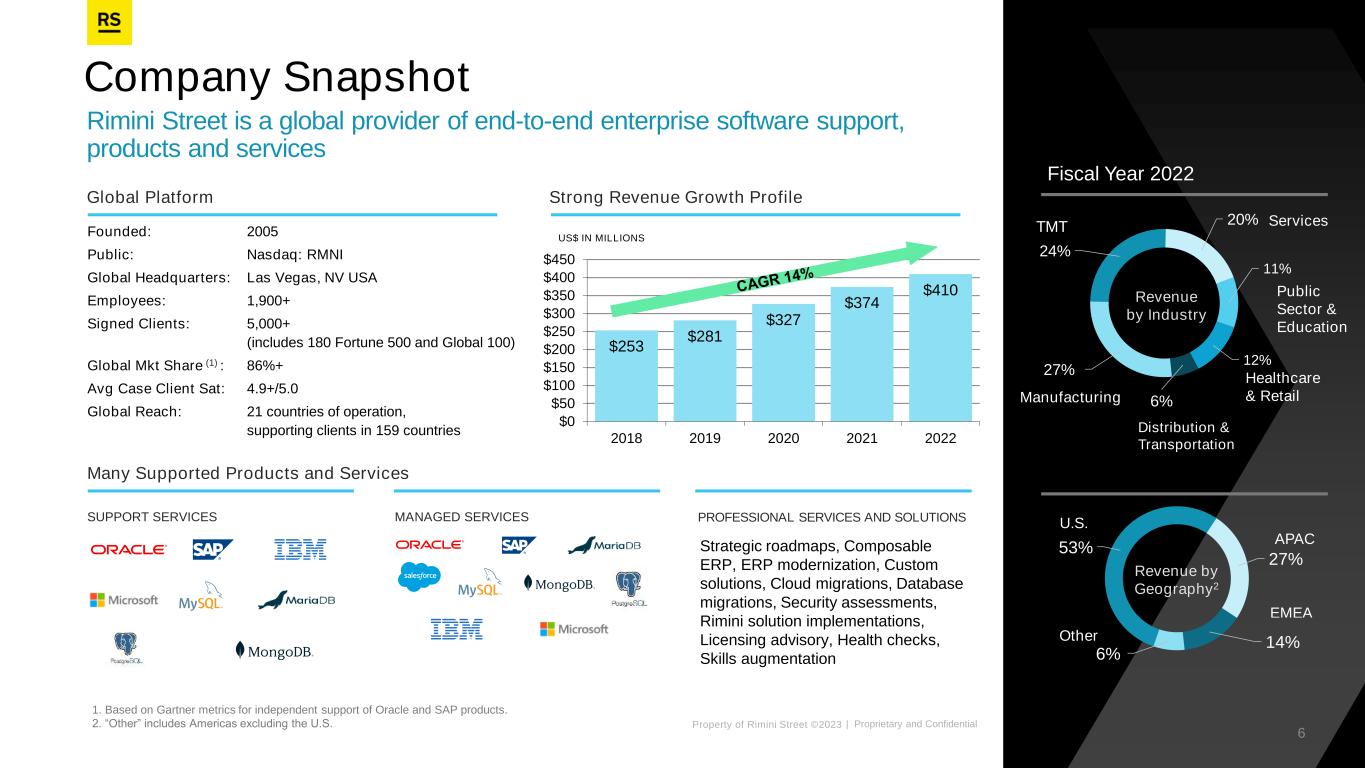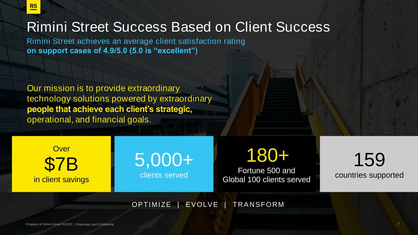 27% 24% 20% 11% 12% 6%Manufacturing TMT Services Public Sector & Education Healthcare & Retail Distribution & Transportation 53% 27% 14% 6% APAC EMEA Other U.S. Company Snapshot Founded: 2005 Public: Nasdaq: RMNI Global Headquarters: Las Vegas, NV USA Employees: 1,900+ Signed Clients: 5,000+ (includes 180 Fortune 500 and Global 100) Global Mkt Share (1) : 86%+ Avg Case Client Sat: 4.9+/5.0 Global Reach: 21 countries of operation, supporting clients in 159 countries Many Supported Products and Services PROFESSIONAL SERVICES AND SOLUTIONSMANAGED SERVICESSUPPORT SERVICES Revenue by Industry Revenue by Geography2 Global Platform Strategic roadmaps, Composable ERP, ERP modernization, Custom solutions, Cloud migrations, Database migrations, Security assessments, Rimini solution implementations, Licensing advisory, Health checks, Skills augmentation Strong Revenue Growth Profile Rimini Street is a global provider of end-to-end enterprise software support, products and services US$ IN MILLIONS 1. Based on Gartner metrics for independent support of Oracle and SAP products. 2. “Other” includes Americas excluding the U.S.. Property of Rimini Street ©2023 | Proprietary and Confidential 6 Fiscal Year 2022 $253 $281 $327 $374 $410 $0 $50 $100 $150 $200 $250 $300 $350 $400 $450 2018 2019 2020 2021 2022