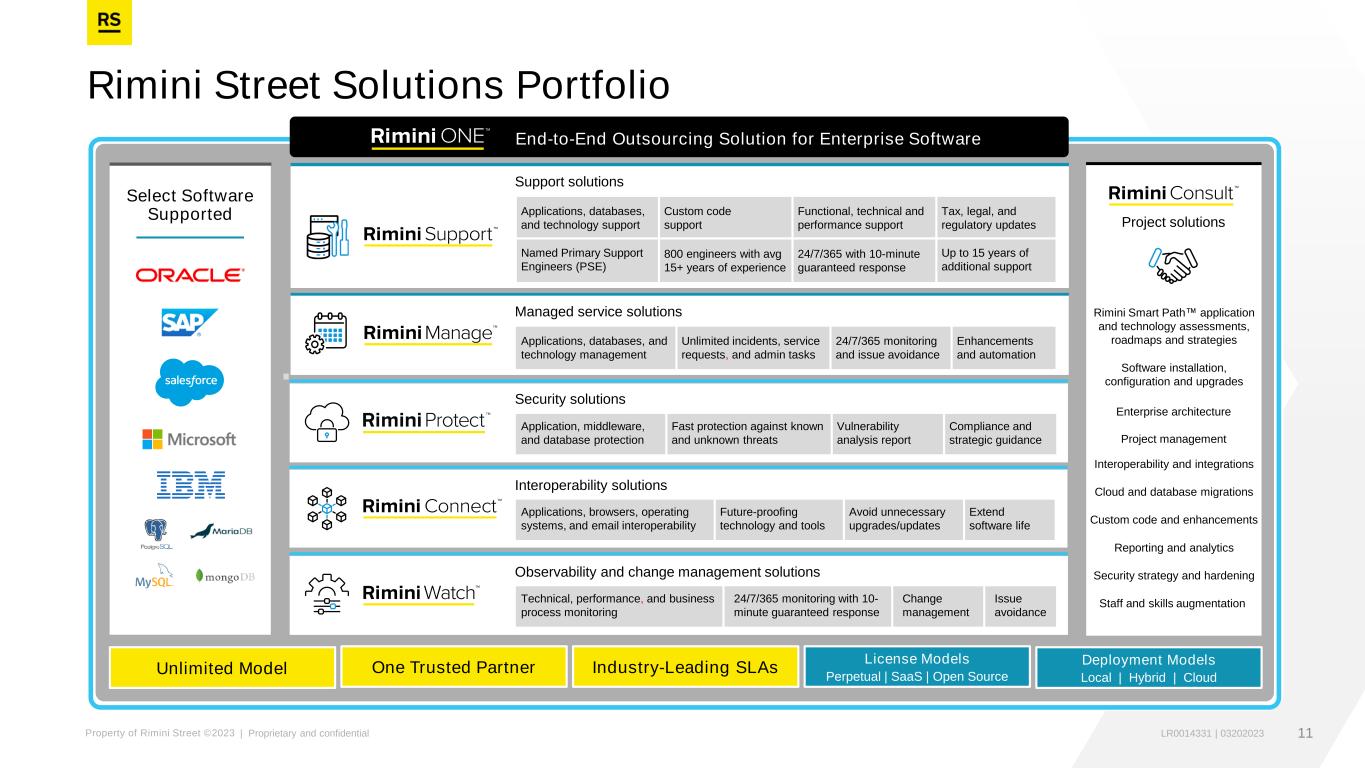 Rimini Street has a portfolio of solutions and expertise for just about every business need TODAY’S Business Challenges Property of Rimini Street ©2023 | Proprietary and Confidential 10 Security, privacy, and compliance Maximizing return on investment Sample Problem Statement “Our ERP and CRM enterprise software is mission-critical to our business, but maintaining it is costly and resource-intensive.” Extract more value from investments and resources while reducing costs Sample Problem Statement “Our business must work smarter and faster. We need more actionable data and insight to make better decisions and run the business better.” Anticipate where customers and the market are going and shift quickly to compete and win Agility and speed Deliver an exceptional experience that exceeds customer expectations and drives advocacy Customer experience Sample Problem Statement “Our market is changing quickly and requires radically different operations and deliverables to meet customer demands.” Keep the business, customers, and data secure and comply with ever-evolving laws Sample Problem Statement “We have a large database landscape. It is expensive to maintain, even more expensive to upgrade — and we worry about securing it.”