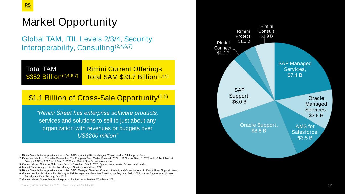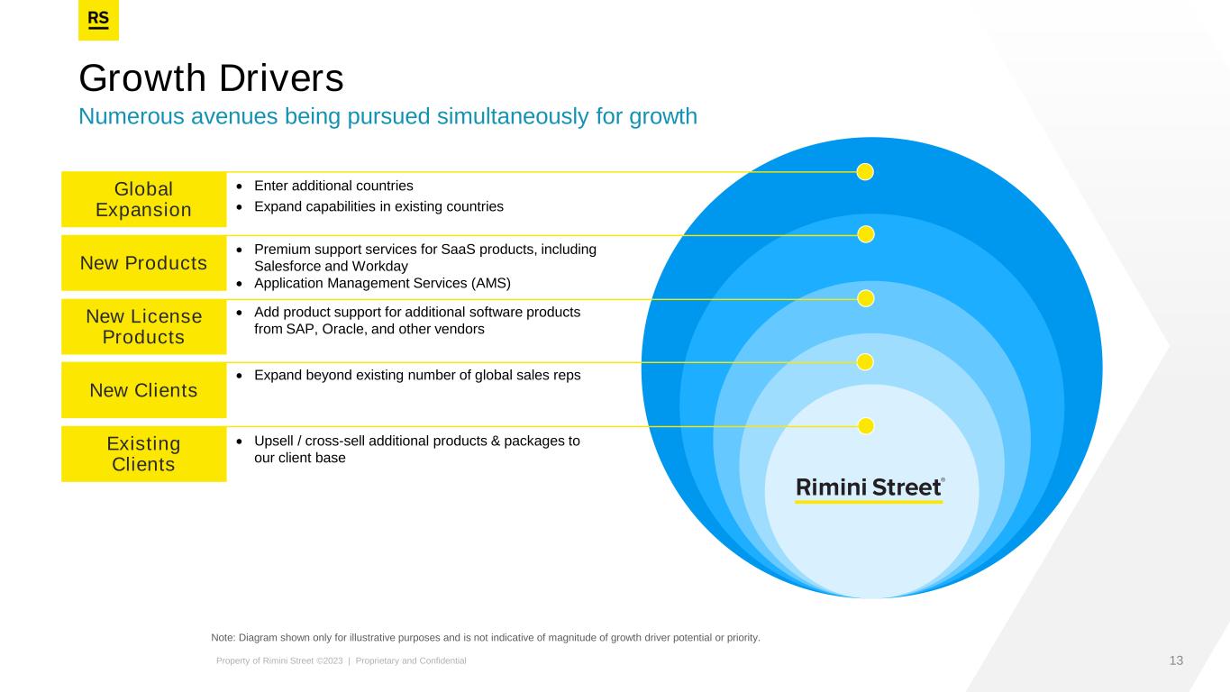 Market Opportunity Property of Rimini Street ©2023 | Proprietary and Confidential 12 Global TAM, ITIL Levels 2/3/4, Security, Interoperability, Consulting(2,4,6,7) Rimini Current Offerings Total SAM $33.7 Billion(1,3,5) Total TAM $352 Billion(2,4,6,7)) SAP Managed Services, $7.4 B Oracle Managed Services, $3.8 B AMS for Salesforce, $3.5 B Oracle Support, $8.8 B SAP Support, $6.0 B Rimini Connect, $1.2 B Rimini Protect, $1.1 B Rimini Consult, $1.9 B $1.1 Billion of Cross-Sale Opportunity(1,5) “Rimini Street has enterprise software products, services and solutions to sell to just about any organization with revenues or budgets over US$200 million” 1. Rimini Street bottom-up estimate.as of Feb 2023, assuming Rimini charges 50% of vendor L3/L4 support fees. 2. Based on data from Forrester Research’s, The European Tech Market Forecast, 2022 to 2027 as of Dec 16, 2022 and US Tech Market Forecast 2022 to 2027 as of Jan 13, 2023 and Rimini Street’s own calculations. 3. Gartner Market Guide for Salesforce Service Providers, Jan 9, 2020, Sparks, Karamouzis, Sullivan, and Heiden. 4. Market Share Analysis: Application Managed Services, Worldwide, 2021. 5. Rimini Street bottom-up estimate as of Feb 2023, Managed Services, Connect, Protect, and Consult offered to Rimini Street Support clients. 6. Gartner Worldwide Information Security & Risk Management End-User Spending by Segment, 2021-2023, Market Segments Application Security and Data Security, Oct 2022. 7. Gartner Market Share Analysis: Integration Platform as a Service, Worldwide, 2021.