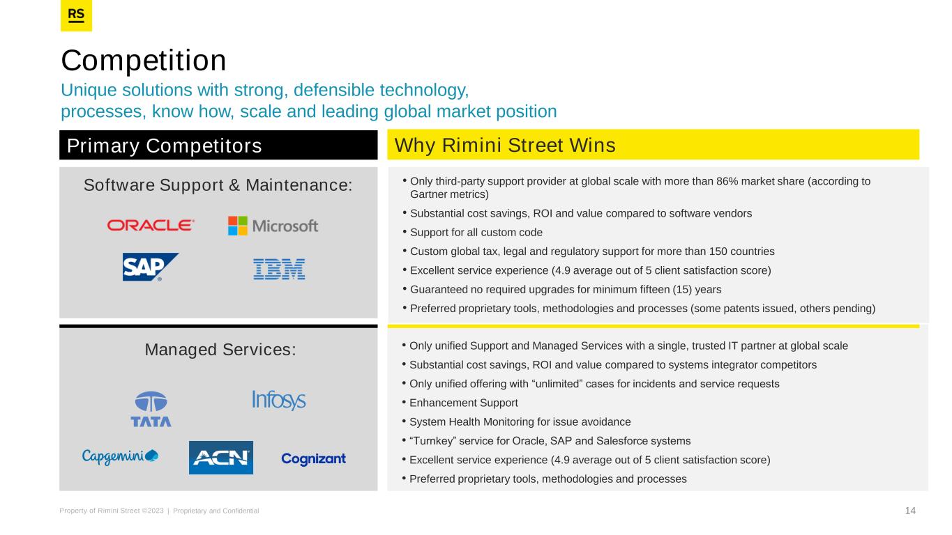 New Clients Growth Drivers Property of Rimini Street ©2023 | Proprietary and Confidential 13 Numerous avenues being pursued simultaneously for growth Note: Diagram shown only for illustrative purposes and is not indicative of magnitude of growth driver potential or priority. Global Expansion New Products New License Products Existing Clients • Enter additional countries • Expand capabilities in existing countries • Premium support services for SaaS products, including Salesforce and Workday • Application Management Services (AMS) • Add product support for additional software products from SAP, Oracle, and other vendors • Upsell / cross-sell additional products & packages to our client base • Expand beyond existing number of global sales reps